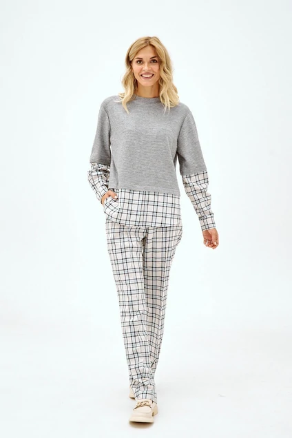 Уютный костюм двухпредметный: состоит из джемпера и брюк. Джемпер из трикотажного полотна свободного кроя с имитацией рубашки. Вырез горловины полукруглый, линия плеча приспущена. Рукава комбинированные, на манжете. Брюки женские классические имеют ровный крой по всей длине с декоративным швом. Посадка по линии талии. Изделие оформлено притачным поясом, спереди карманы,по спинке пояс на эластичной тесьме-резинке, застёжка на петлю-пуговицу и молнию.