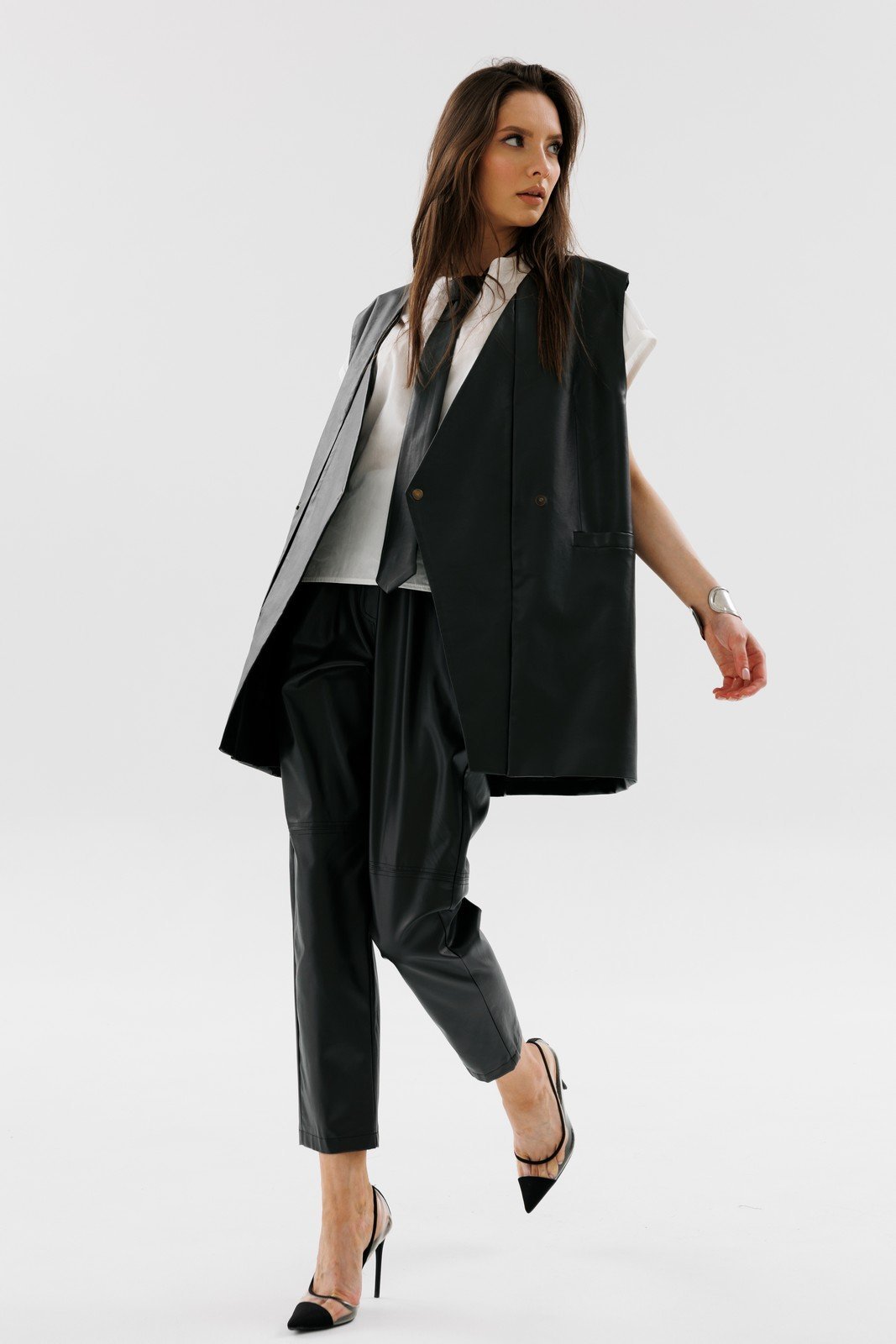 Костюм трёхпредметный: состоит из жилета, брюк и галстука. Жилет двубортный прямого кроя объёма оверсайз. Застёжка фигурная на кнопки. Карманы - листочки. Галстук классический на резинке. Брюки с притачным поясом, горизонтальным рассечением в области колена и с карманами в боковых швах..