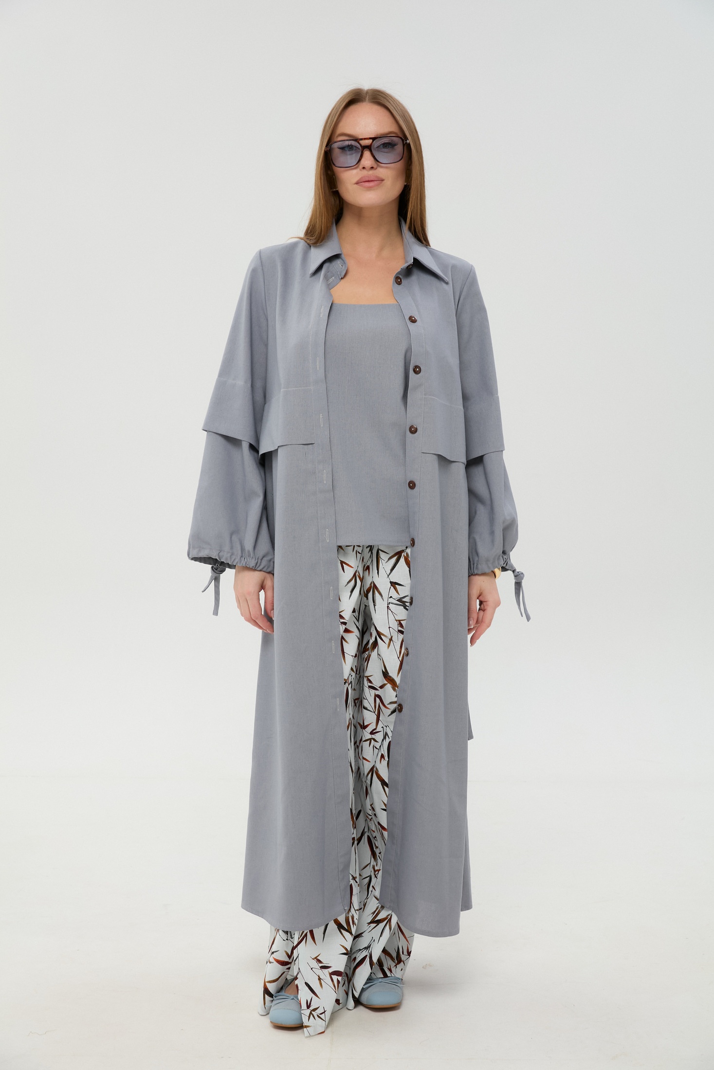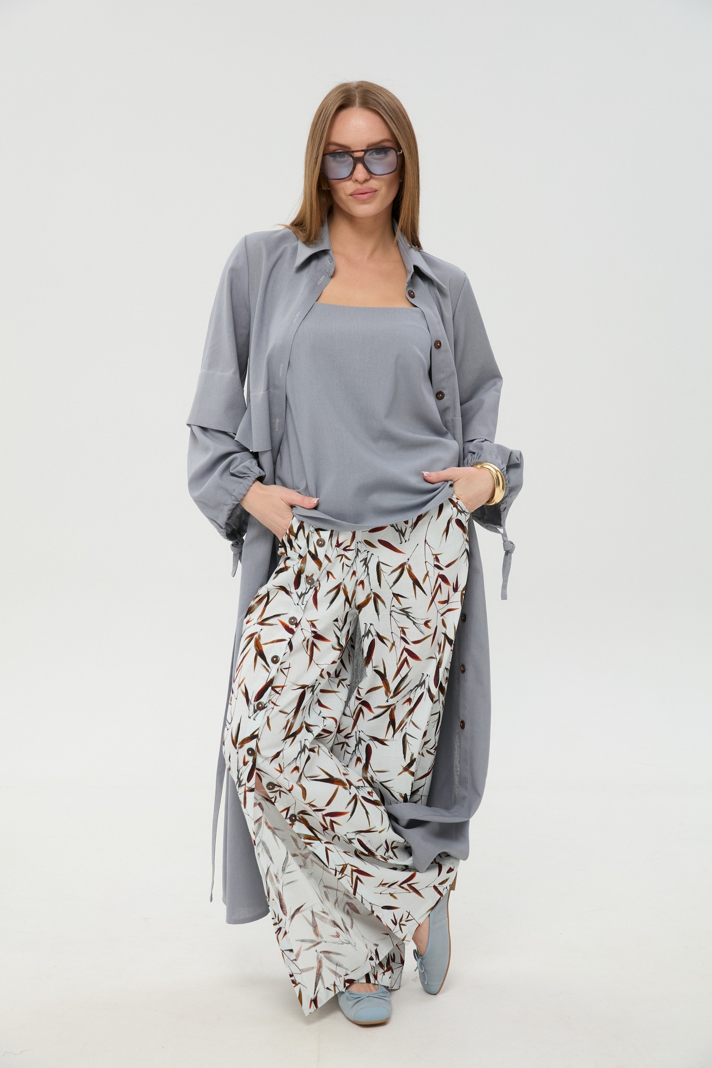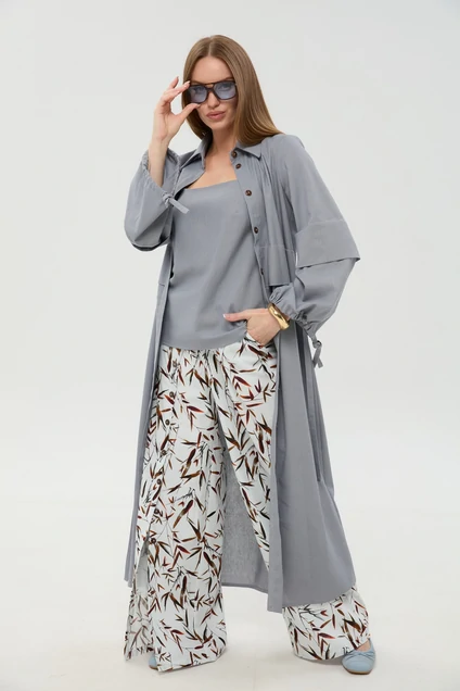 Костюм брючный 976-15 серый и листья мультиколор NikVa идеально подходит для стильных дам. Коллекция бренда NikVa предлагает уникальное сочетание стиля и комфорта. Платье-кардиган макси выполнено из смеси льна, вискозы и хлопка, обеспечивая мягкость и легкость изделия. Центральная отрезная застежка на потайные пуговицы и пояс добавляют изысканности. Брюки свободного кроя с широкой резинкой и функциональными карманами создают непринужденный образ. Топ на регулируемых бретелях завершает комплект. Серый цвет в сочетании с мультиколорными листьями делает костюм универсальным вариантом для весеннего и летнего сезонного гардероба. Подходит как для офисного стиля, так и для отдыха.