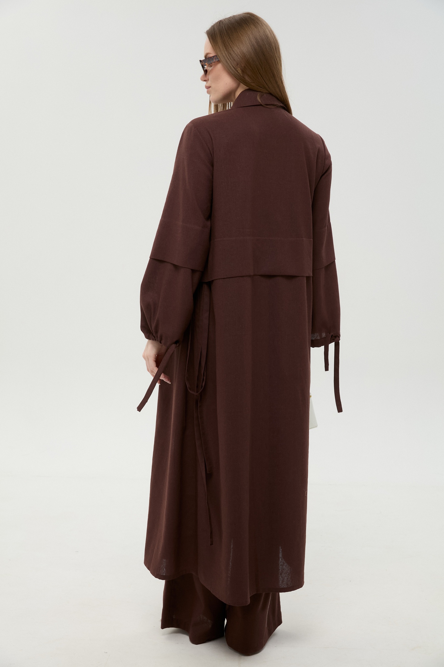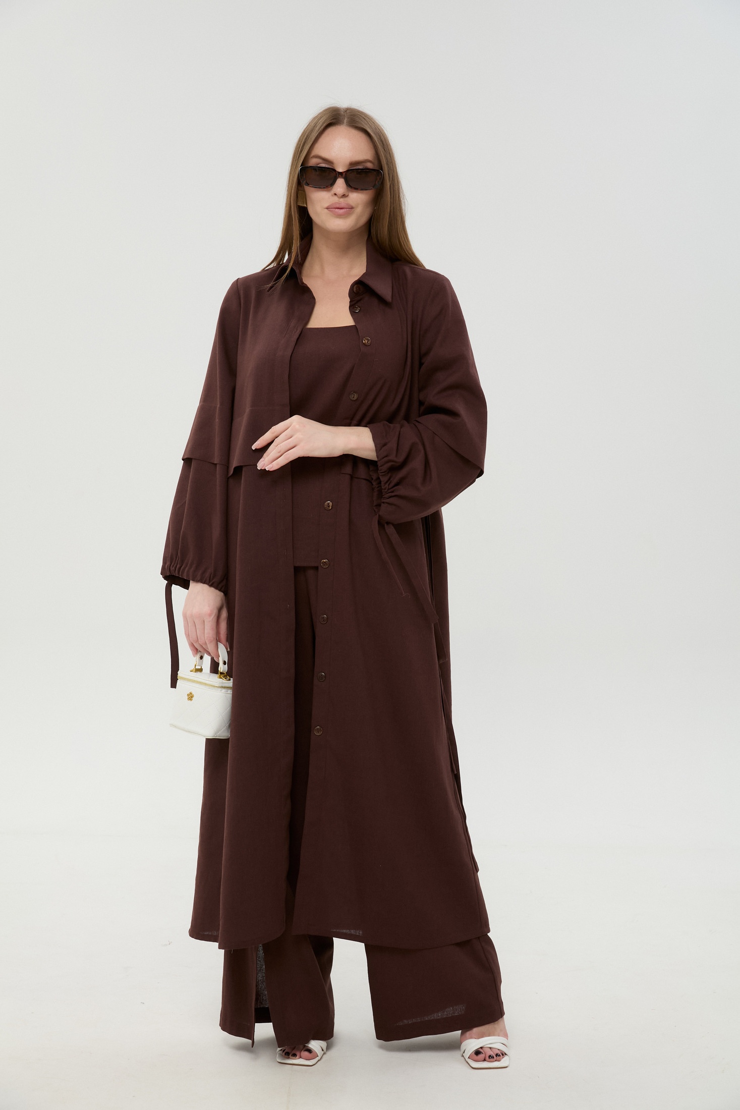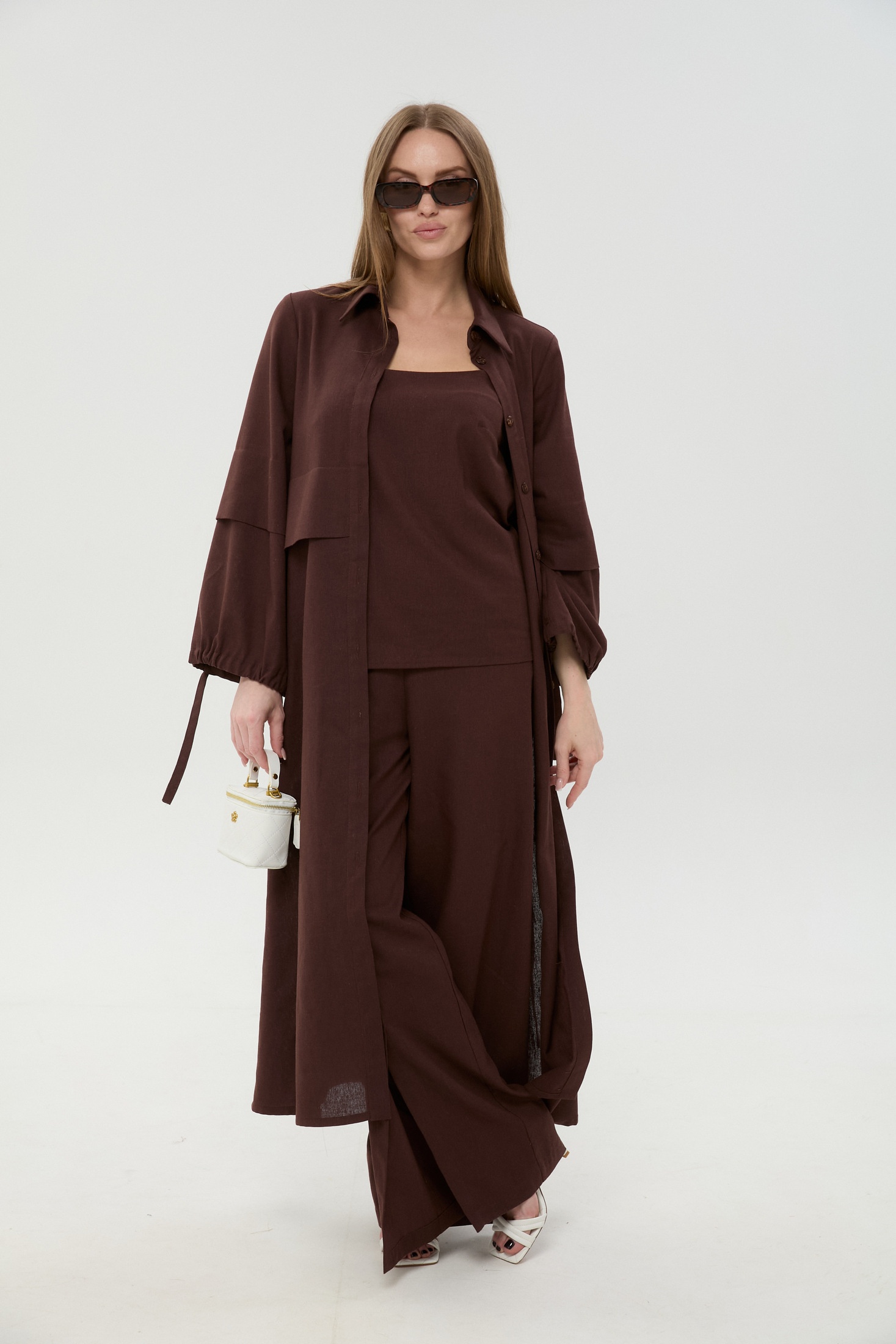 Костюм брючный 976-19 шоколад NikVa — это стильное решение для современного гардероба. Коллекция бренда NikVa выделяется своими уникальными решениями и качественными материалами. Этот комплект включает кардиган-платье, брюки и топ, изготовленные из сочетания льна, вискозы и хлопка, что обеспечивает комфорт и устойчивость к износу. Платье-кардиган имеет планку с пуговицами, стоячий рубашечный воротник и завязки на рукавах для фиксации. Широкие брюки на резинке оснащены функциональными карманами, а топ регулируется по длине бретелей. В теплый сезон этот наряд станет незаменимым благодаря своему универсальному шоколадному цвету и свободному крою. Идеально подходит для повседневных прогулок и деловых встреч.