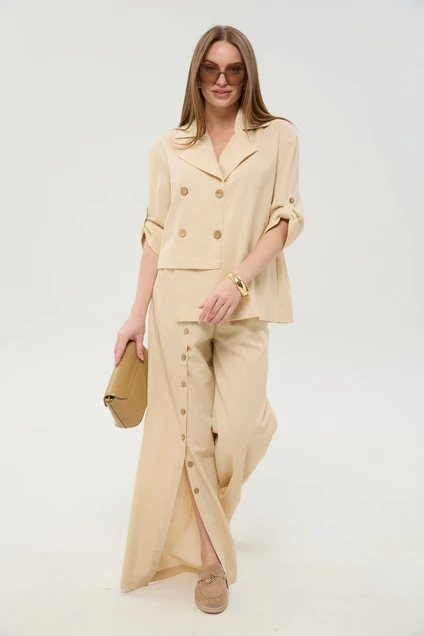 Костюм брючный 979-10 песок NikVa создан для тех, кто ценит комфорт и стиль. Коллекция бренда NikVa предлагает изысканный двухпредметный комплект, состоящий из жакета и брюк. Жакет прямого силуэта с воротником пиджачного типа украшен имитацией центральной застёжки на пуговицы, а рукав длиной три четверти застёгивается на пату, добавляя практичности. Брюки свободного кроя с широкой резинкой на талии обеспечивают удобство в носке. Изделие украшено планкой с петлями и пуговицами для оригинальности. Материал из льна, вискозы и хлопка идеален для тёплой погоды, а светло-бежевый оттенок легко сочетается с другими вещами гардероба. Идеально подходит для летних прогулок и расслабленного офиса.