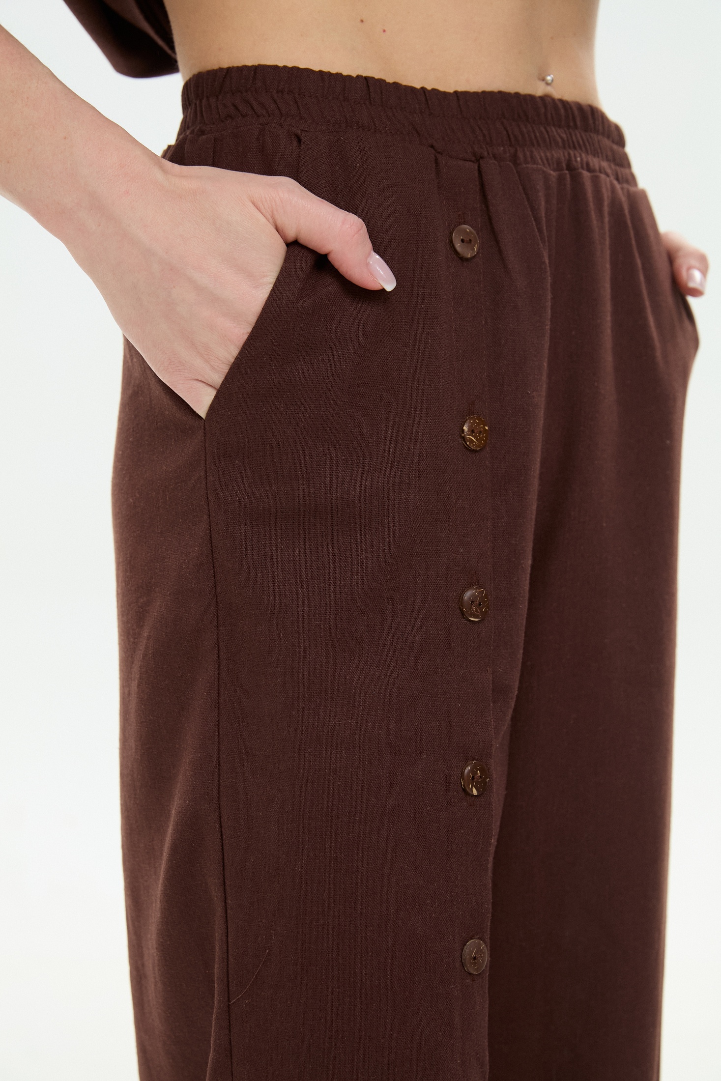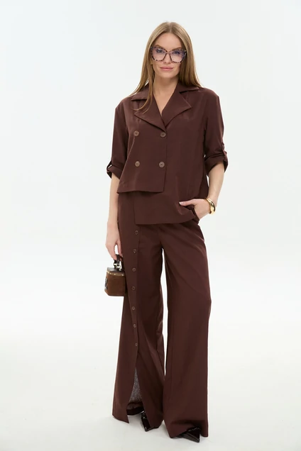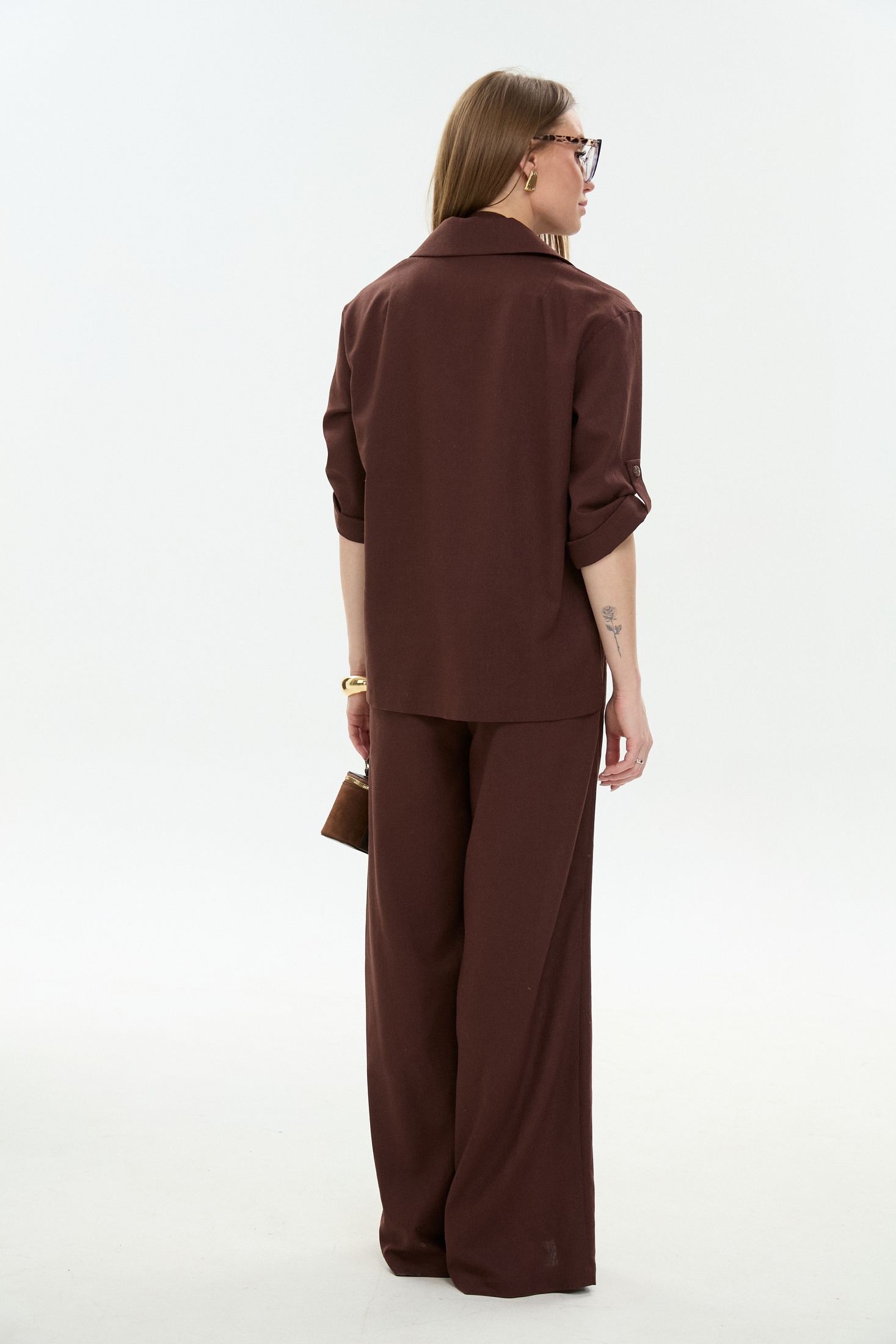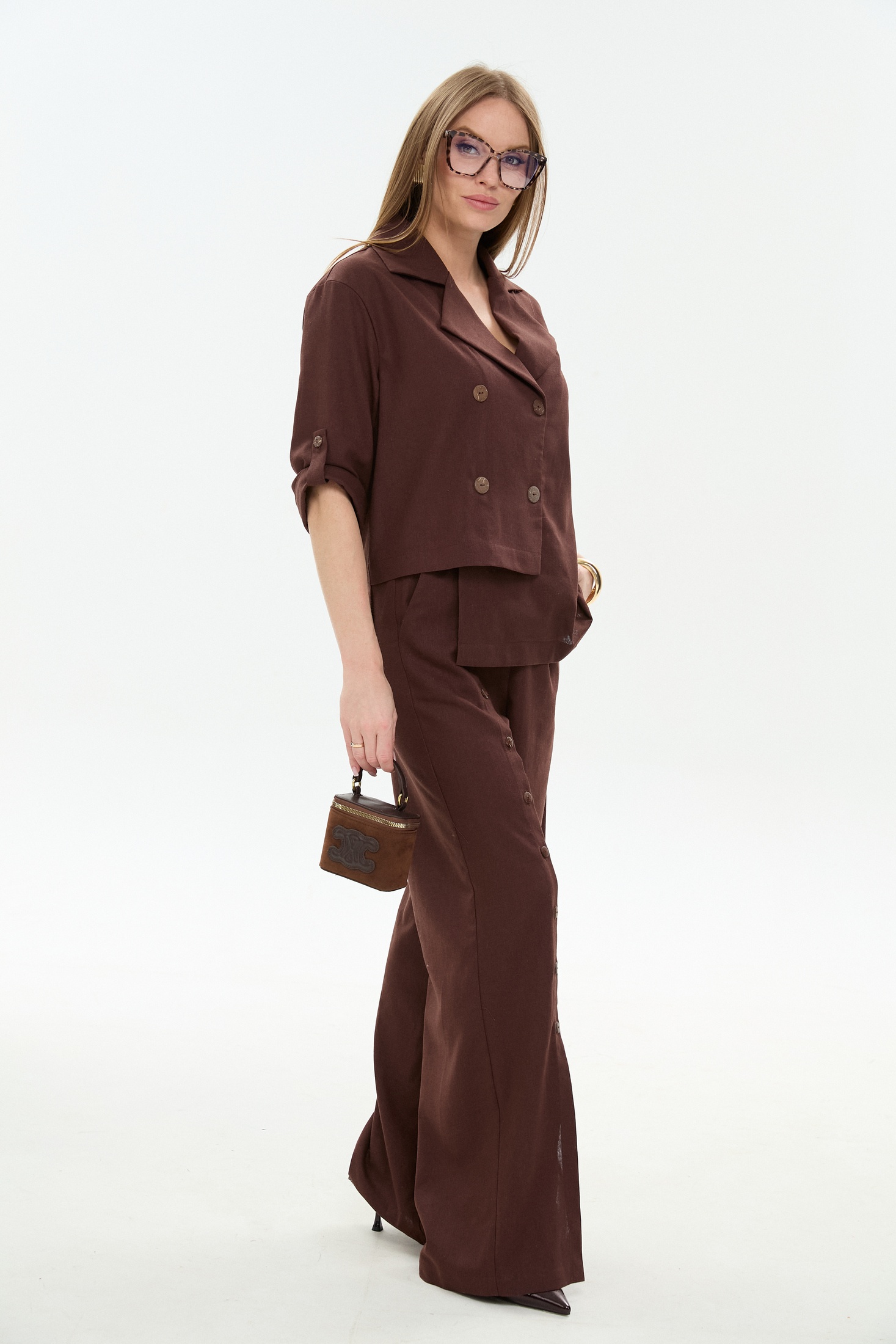 Костюм брючный 979-6 шоколад NikVa — это превосходный выбор для делового гардероба. Коллекция бренда NikVa представлена в универсальном шоколадном цвете, который подчеркнёт профессионализм и уверенность. Материалы — 28% лён, 49% вискоза и 23% хлопок — обеспечивают комфорт и дышащие свойства, идеально подходящие для весенне-летнего периода. Жакет прямого силуэта с пиджачным воротником и фигурным низом, рукава длиной три четверти, застёгиваются на пату. Свободные брюки с эластичным поясом и функциональными карманами дополняют образ, добавляя практичности и плавности линий. Костюм отличается имитацией застёжки на пуговицы на жакете и стильной планкой с пуговицами на брюках, создавая современный и деловой стиль.