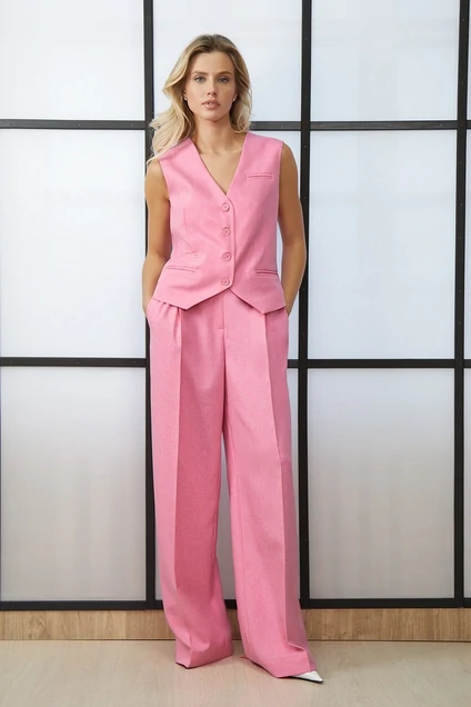 Костюм состоит из жилета и брюк. Жилет на подкладке полуприлегающего силуэта. Центральная застежка на петли и пуговицы. V-образный вырез горловины. По переду нагрудные вытачки и прорезные карманы в рамку (не функциональные). По спинке средний шов и рельефы. Фигурный низ изделия.