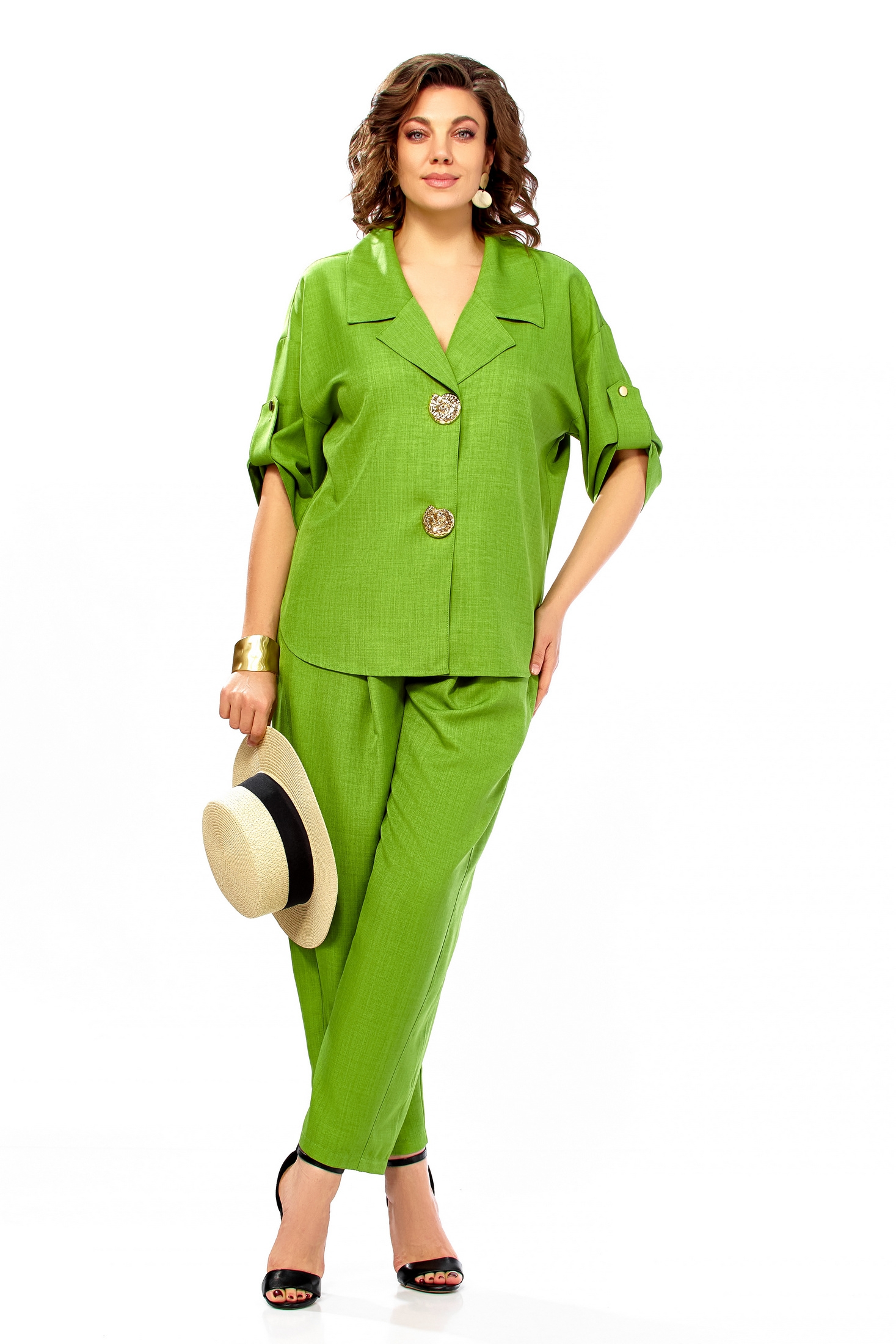 Костюм брючный 1013 яблоко Ольга Стиль предлагает идеальное сочетание комфорта и стиля. Коллекция бренда Ольга Стиль выполнена из высококачественного полиэстера и вискозы с добавлением спандекса, обеспечивая эластичность и приятные тактильные ощущения. Свободный силуэт с зауженными брюками и пиджаком классического кроя позволяет создать современный повседневный образ. Яркий зеленый цвет добавит яркости в ваш гардероб, а спущенные рукава с пата на пуговицу придают уникальность. Фигурный низ и декоративные кнопки завершают образ, делая его подходящим для весенне-летнего сезона. Длина спинки 69 см, длина рукава 55 см, длина брюк 100 см делает костюм комфортным для ежедневного ношения.