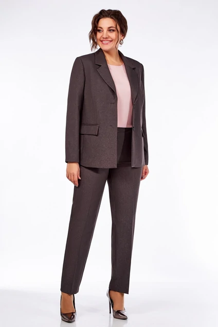Костюм трехпредметный, состоящий из жакета, брюк и блузки. Жакет на подкладке полуприлегающего силуэта с застежкой на петли и пуговицы, по переду обработаны прорезные карманы с клапаном, рельефные швы. Спинка со средним швом и вытачками. Рукав втачной, двухшовный. Блузка прямого силуэта, с нагрудными вытачками, разрезами в боковых швах, рукав втачной короткий. Брюки на поясе, прямые, слегка заужены к низу, застежка на пуговицу и тесьму молнию. Дл жакета 68см, дл рукава 62см , дл брюк с учетом пояса 103см, длина блузки 63см. блузка вискоза 100%