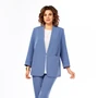 Летний комплект состоящий из жакета, брюк и блузы. Жакет прямого силуэта с пиджачным воротником, без подкладки и без застежки. По бокам накладные карманы с клапанами. На правом клапане декоративная нашивка. По талии кулиска. Рукава втачные, длиной три четверти с патами. Брюки прямые, зауженные к низу, с отворотом, пояс притачной на эластичной тесьме с кулиской, боковые карманы . Блуза прямого силуэта, рукав короткий. Длина блузы 73 см, длина жакета 74 см, длина рукава жакета 48 см, длина брюк 100 см