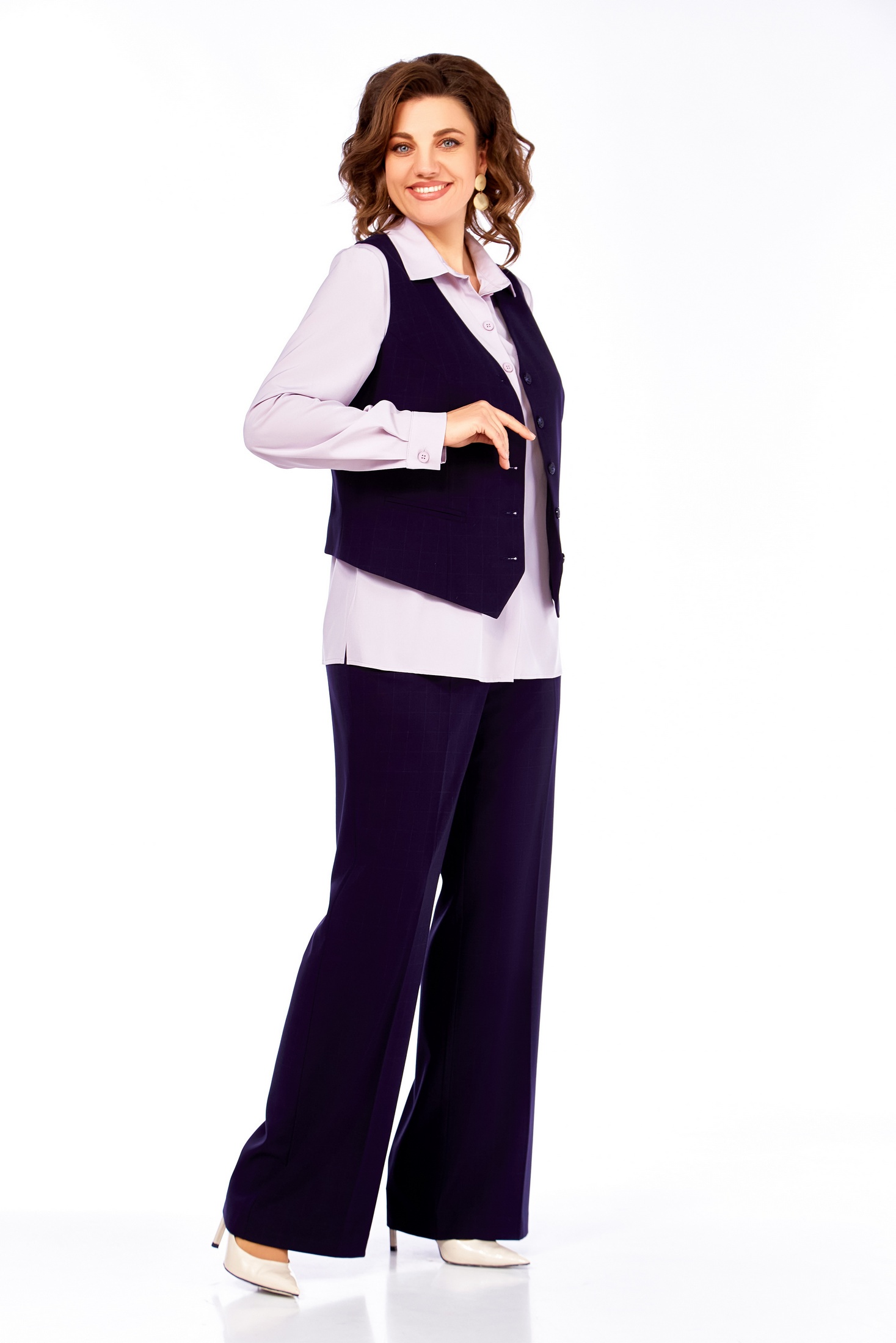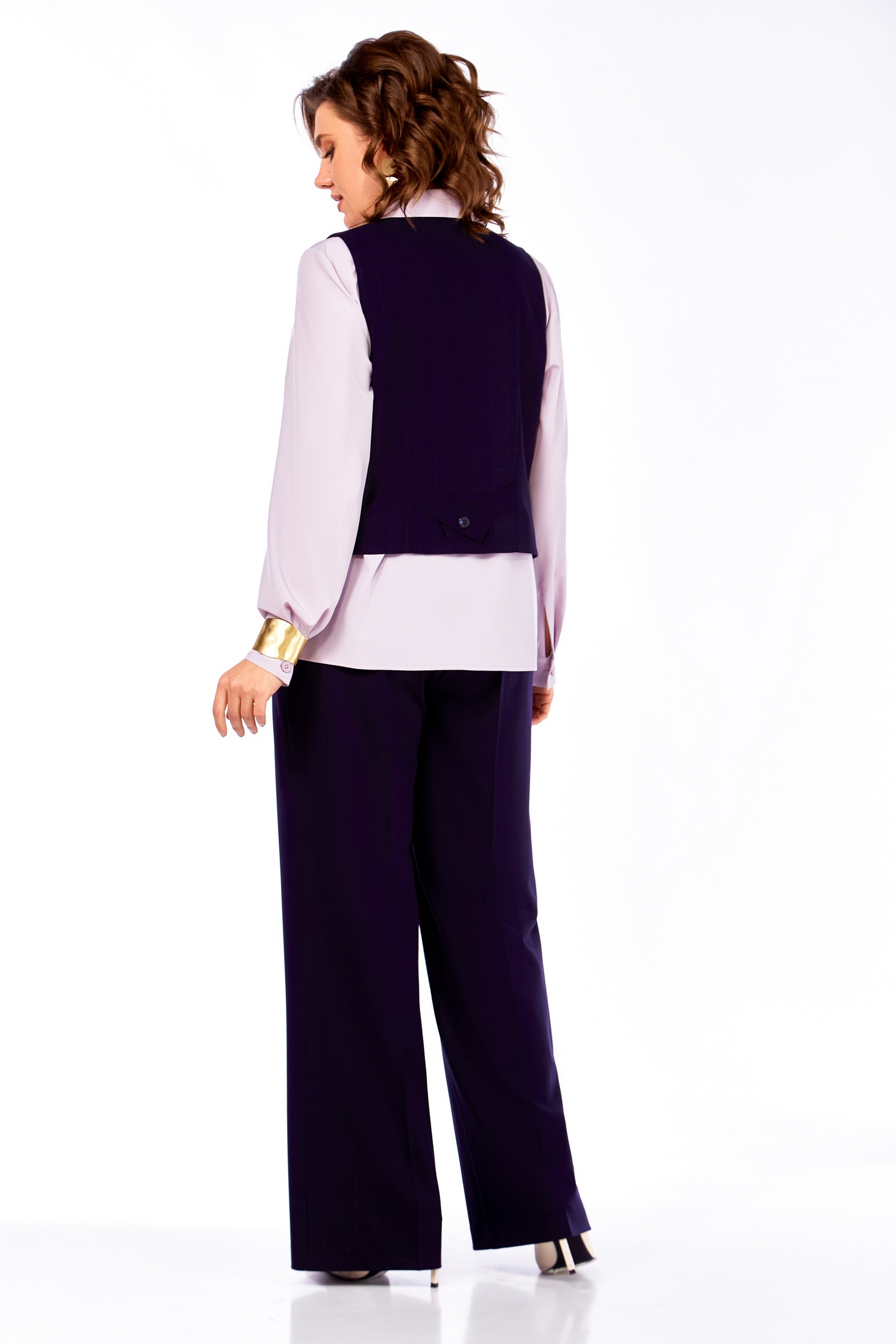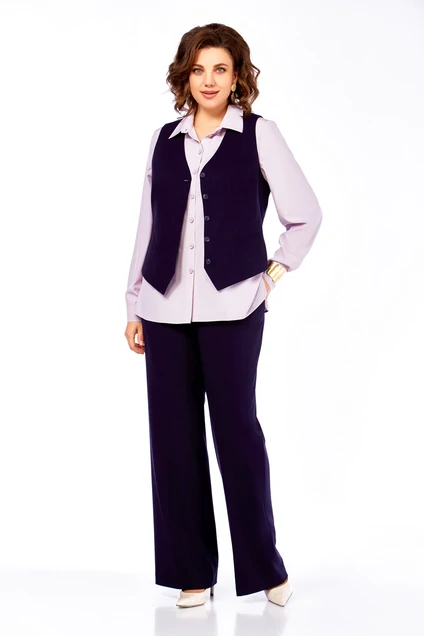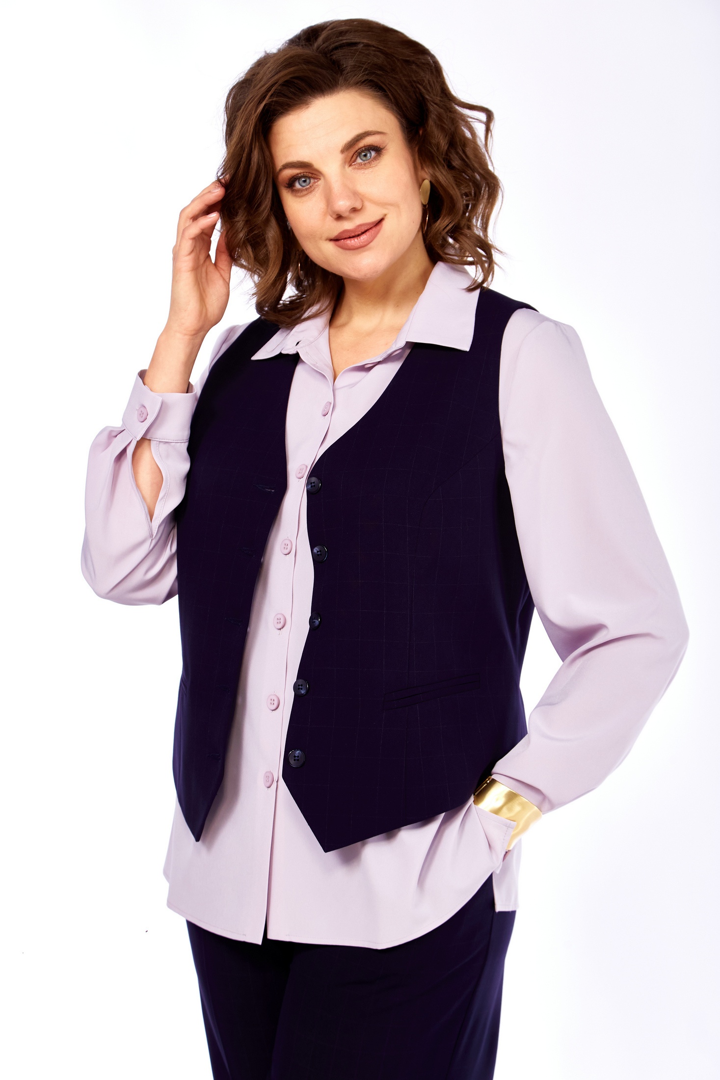 Комплект женский, состоит из блузки, жилета и брюк. Полуприлегающий силуэт, жилет с V-образной формой горловины, на переде рельефы от проймы, имитация карманов с клапаном, по спинке хлястик с пуговицей. Блузка с рубашечным воротником и застежкой на петли и пуговицы, нагрудные вытачки, рукав одношовный с манжетой. Разрезы в боковых швах. Брюки прямые, с карманами. Пояс по спинке на резинке. На переде и спинке заутюжены стрелки. Длина жилета49см, блина блузки 70см, длина брюк 111см.
