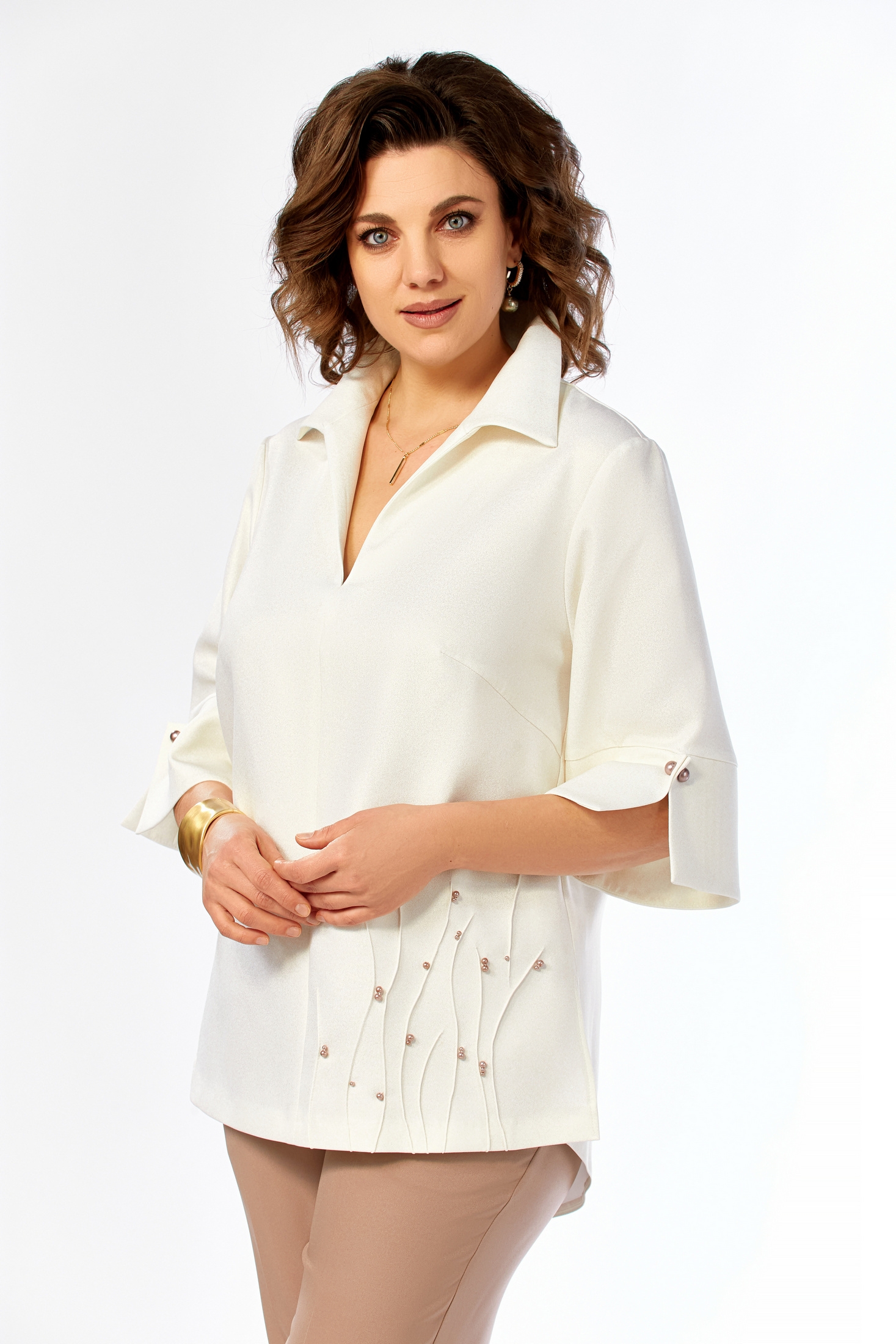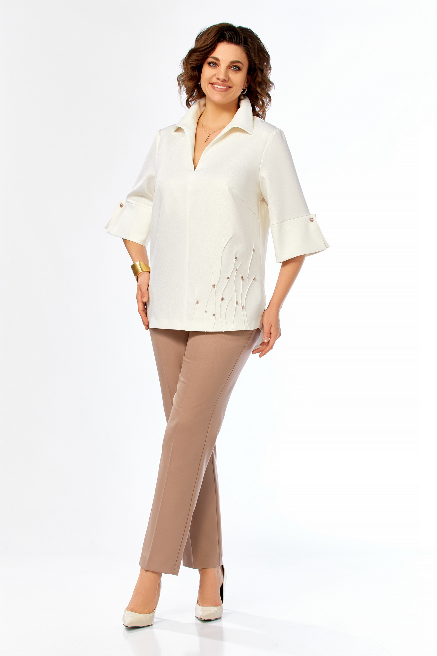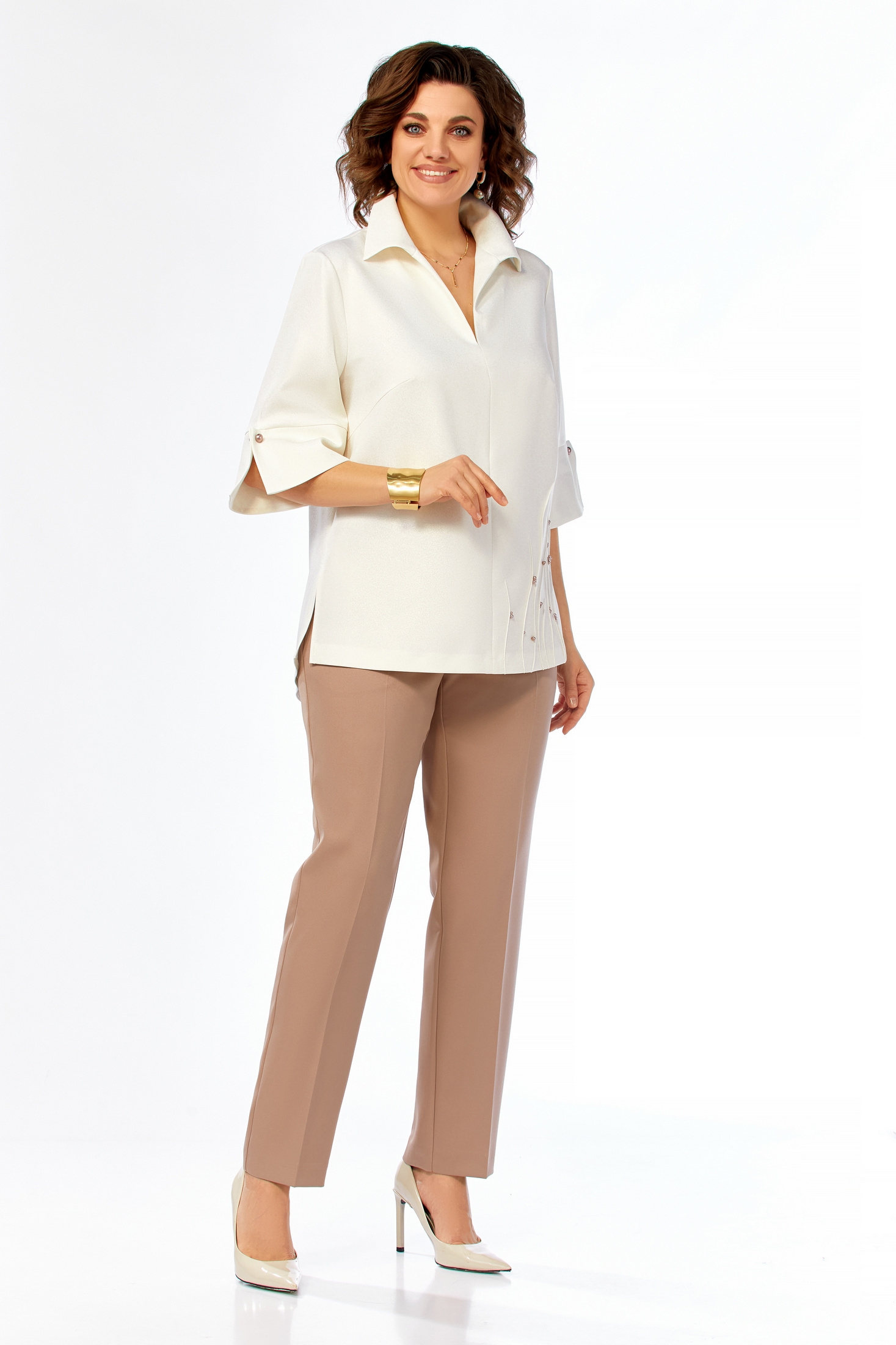 Костюм брючный 987 молочно-коричневый Ольга Стиль сочетает в себе элегантность и комфорт. Коллекция бренда Ольга Стиль предлагает изысканный комплект из блузы и брюк. Блузка выполнена из ткани с легким блеском, подчеркивающим ее стиль. V-образный вырез горловины, отложной воротник и декоративные элементы делают эту модель уникальной. Длина блузы составляет 75 см, а длина брюк — 105 см. Брюки однотонные, слегка зауженные к низу, что идеально подчеркивает фигуру. Основной материал — комбинация полиэстера, вискозы и эластана, обеспечивающая комфорт и долговечность. Костюм подойдет для офиса и деловых встреч благодаря классическому стилю и удобной посадке. Идеален для весны и осени благодаря своим цветам и универсальности.