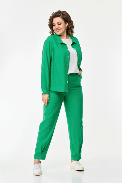 Комплект выполнен в стиле «Деним». Жакет прямого силуэта с кокетками по переду и спинке, вертикальными рельефами. Карманы расположены в рельефах. Воротник стоячий, отложной. Рукав прямой, длинный, двухшовный с притачной манжетой. Завершает образ стиля «Деним» отделочная строчка по швам и металлические кнопки. Брюки свободного силуэта с притачным поясом на резинке. По низу передней половины брюк встречная складка. По низу брюк притачная манжета. Туника со спущенным рукавом, притачным и манжетами. Туника выполнена из высококачественного хлопка.