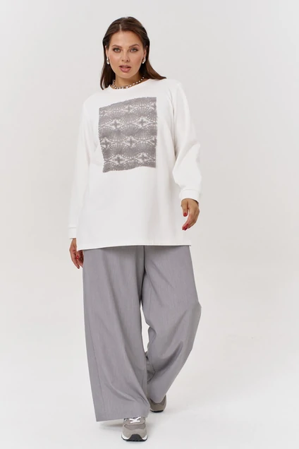 Невероятно комфортный комплект состоит из трикотажного джемпера и брюк. Джемпер свободного покроя с круглой горловиной. Рукав втачной, полномерный по обхвату, на манжете. По переду авторская вязаная аппликация шерстяным кружевом. Для удобства в боковых швах разрезы. Брюки в свободного силуэта в стиле палаццо, прямого кроя, с высокой посадкой. В боковых швах наклонные карманы. Притачной пояс на резинке. Оригинальный брючный комплект oversize благодаря качественным лекалам хорошо садится по фигуре, не мнётся, удобен для повседневной носки и прекрасно выглядит! Ткань хорошо тянется и это позволяет вам комфортно себя чувствовать. Комплект подойдет для прогулки, встречи с друзьями. Вы с удовольствием оцените крой и удобство комплекта.