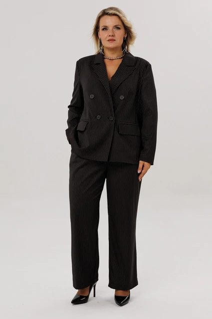 Элегантный костюм в мелкую полоску из новой коллекции обрадует Вас посадкой и качеством пошива. Состоит из жакета и брюк. Классический приталенный двубортный жакет с пиджачным воротником на подкладке прямого кроя, имеет удобные функциональные карманы с клапанами, что добавляет практичности. Жакет на застёжке на декоративных пуговицах. Прямые брюки с высокой посадкой, на резинке. Для удобства и функциональности в боковых швах карманы- «хулиганы». Оригинальный костюм oversize – идеальное решение для современной женщины, он хорошо садится по фигуре, не мнётся, удобен для повседневной носки и прекрасно выглядит! Ткань хорошо тянется и это позволяет вам комфортно себя чувствовать. Этот костюм – готовый ансамбль для офиса, деловой встречи или прогулки.