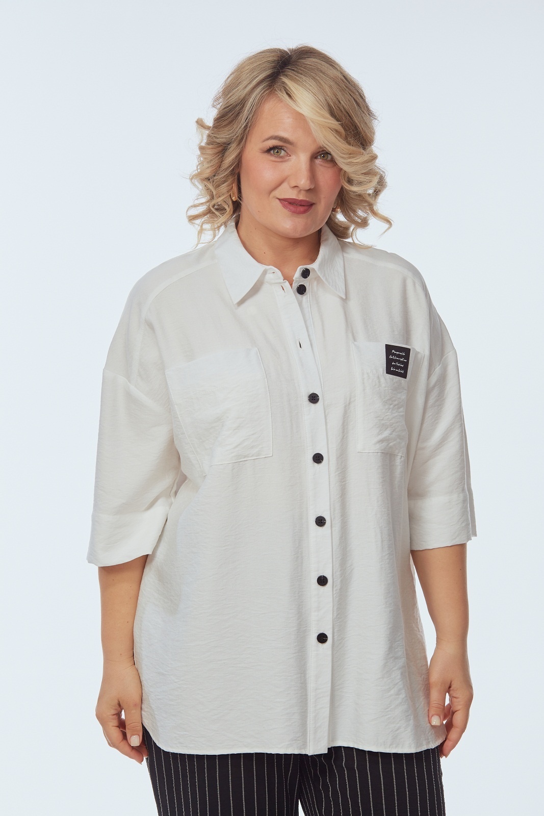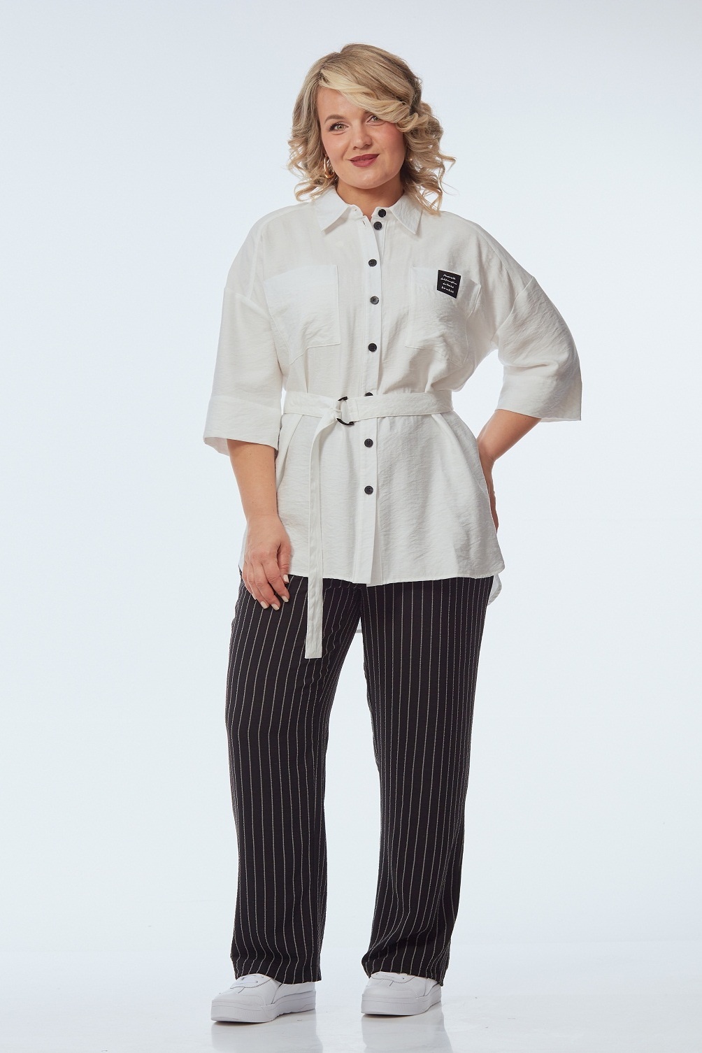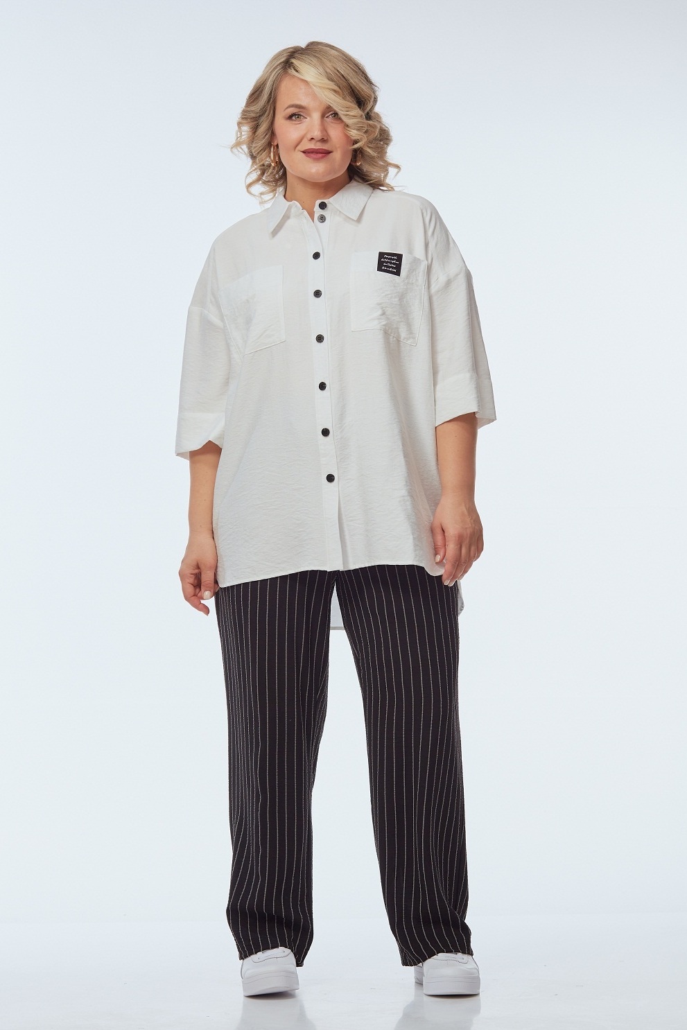 Костюм брючный 248 белый с черно-белым OVERYOU выделяется стильным и функциональным дизайном. Коллекция бренда OVERYOU включает комфортные комплекты, сделанные из мягкого материала верха с 70% вискозы и 30% льна, а также из стойких к сминанию брюк с 85% полиэстера и 15% вискозы. Свободного кроя рубашка с центральной застежкой, 3/4 рукавами и воротником на стойке придаёт эффектный вид. Интересные контрастные пуговицы, нашивка дизайнера и пояс с пряжкой делают образ завершенным. Прямые брюки с высокой посадкой на резинке обеспечивают дополнительный комфорт и функциональность благодаря боковым карманам. Контрастная цветовая палитра делает костюм подходящим для офисных и деловых встреч, а также неспешных прогулок. Белый и черно-белый цвет костюма создают элегантный образ, подходящий для любого времени года.
