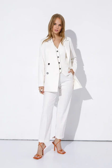 Текстильный костюм-тройка из двубортного жакета свободного покроя, жилета и брюк с высокой посадкой. Детали: жакет прямого силуэта, пиджачный воротник, прорезные карманы, спинка со средним швом, втачные двухшовные рукава, жакет на подкладке. Жилет с талевыми вытачками, застежка на петли и пуговицы, функциональные карманы, фигурный низ, на подкладке. Брюки на притачном поясе со шлевками, передние половины с небольшими мягкими складками и заутюженными стрелками, застежка на молнию и пуговицу, боковые карманы