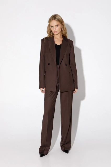 Текстильный костюм-двойка из двубортного полуприлегающего жакета и прямых брюк со стрелками. Детали: жакет с отрезными бочками и нагрудными вытачками, пиджачный воротник, прорезные карманы, застежка на петли и пуговицы, спинка со средним швом, втачные двухшовные рукава, жакет на подкладке. Брюки с высокой посадкой на притачном поясе со шлевками, передние половины с небольшими застроченными мягкими складками и заутюженными стрелками, застежка на молнию и пуговицу, боковые карманы.