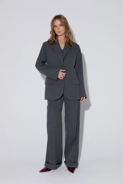 Костюм-двойка из оверсайз жакета и прямых широких брюк со стрелками из текстильной ткани. Детали: жакет прямого силуэта, расширенная линия плеч, пиджачный воротник, перед с прорезными функциональными карманами, однобортная застежка на петли и пуговицы, спинка со средним швом и шлицей, рукава втачные двухшовные, жакет на подкладке. Брюки с высокой посадкой на притачном поясе со шлевками, пояс прямой без резинки, застежка на молнию и пуговицу, боковые карманы, передние половины с заутюженными стрелками и двумя небольшими складками. Задние части брюк с вытачками и заутюженными стрелками.