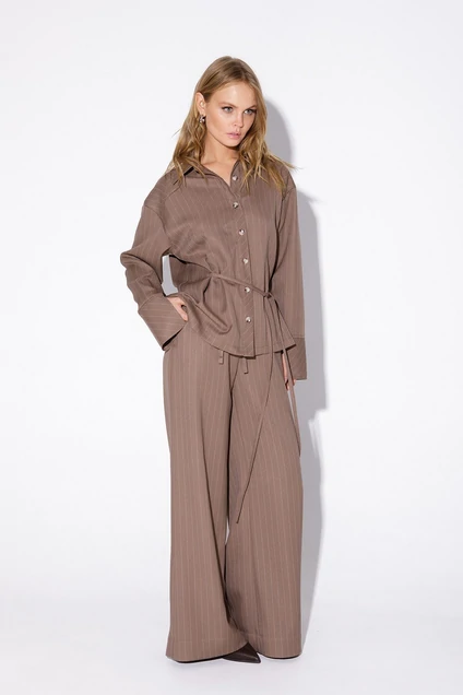 Костюм-двойка в полоску из свободной рубашки со съемными элементами и прямых широких брюк с поясом-резинкой.
