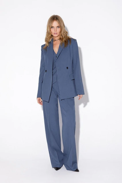 Текстильный костюм-тройка из двубортного полуприлегающего жакета, жилета и прямых брюк со стрелками. Детали: жакет с отрезными бочками и нагрудными вытачками, пиджачный воротник, прорезные карманы, застежка на петли и пуговицы, спинка со средним швом, втачные двухшовные рукава, жакет на подкладке. Жилет полуприлегающего силуэта, талиевые вытачками, застежка на петли и пуговицы, функциональные карманы, фигурный низ, на подкладке. Брюки с притачным поясом со шлевками, передние половины с небольшими застроченными мягкими складками и заутюженными стрелками, застежка на молнию и пуговицу, боковые карманы. Задние части брюк с вытачками и заутюженными стрелками. Пояс брюк прямой, без резинки.