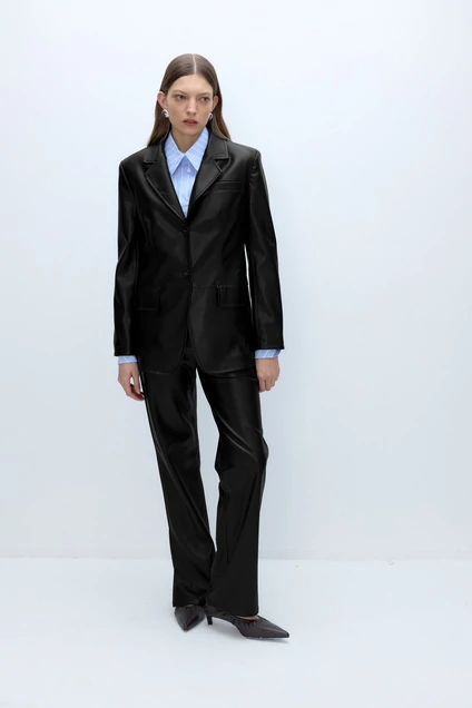 Костюм-двойка из свободного жакета и прямых брюк из экокожи.