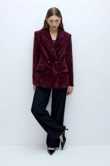 Детали: жакет свободного покроя и полуприлегающего силуэта, двубортная застежка на петли и пуговицы, отрезные бочки, пиджачный воротник, функциональные карманы, жакет на подкладке. Брюки с высокой посадкой, притачной пояс со шлевками, передние половины с небольшими застроченными мягкими складками и заутюженными стрелками, застежка на молнию и пуговицу, боковые карманы. Задние части брюк с вытачками и заутюженными стрелками. Пояс брюк прямой, без резинки.
