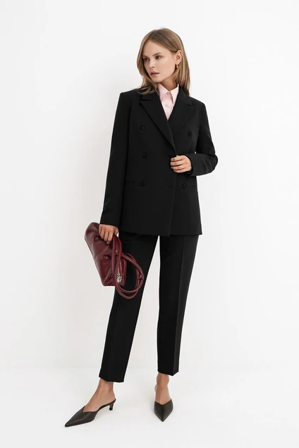 Текстильный костюм-тройка из двубортного жакета, полуприлегающего жилета и укороченных брюк со средней посадкой.