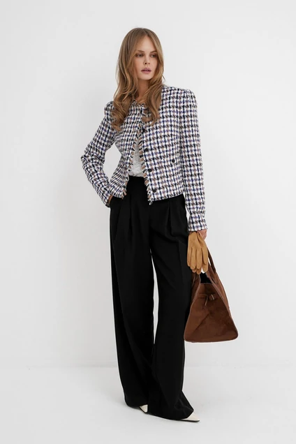 Костюм-двойка из укороченного жакета из фактурной ткани в стиле «шанель» и брюк-палаццо.