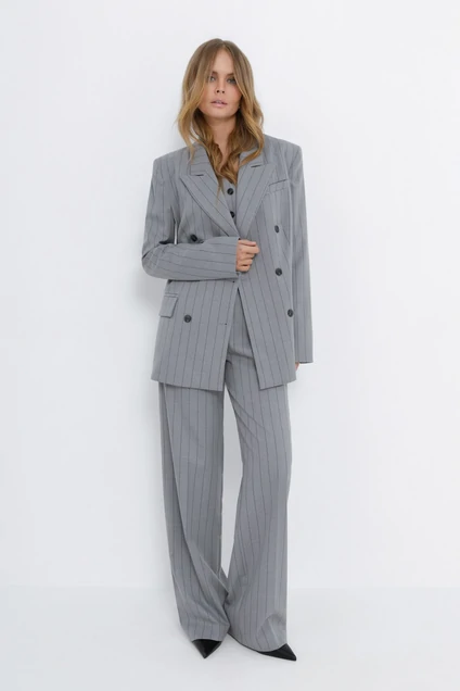 Костюм-двойка в полоску из свободного жакета и прямых широких брюк со стрелками.
