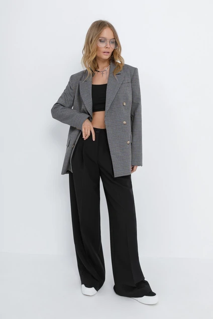 Текстильный костюм-двойка из свободного жакета в клетку и брюк-палаццо.