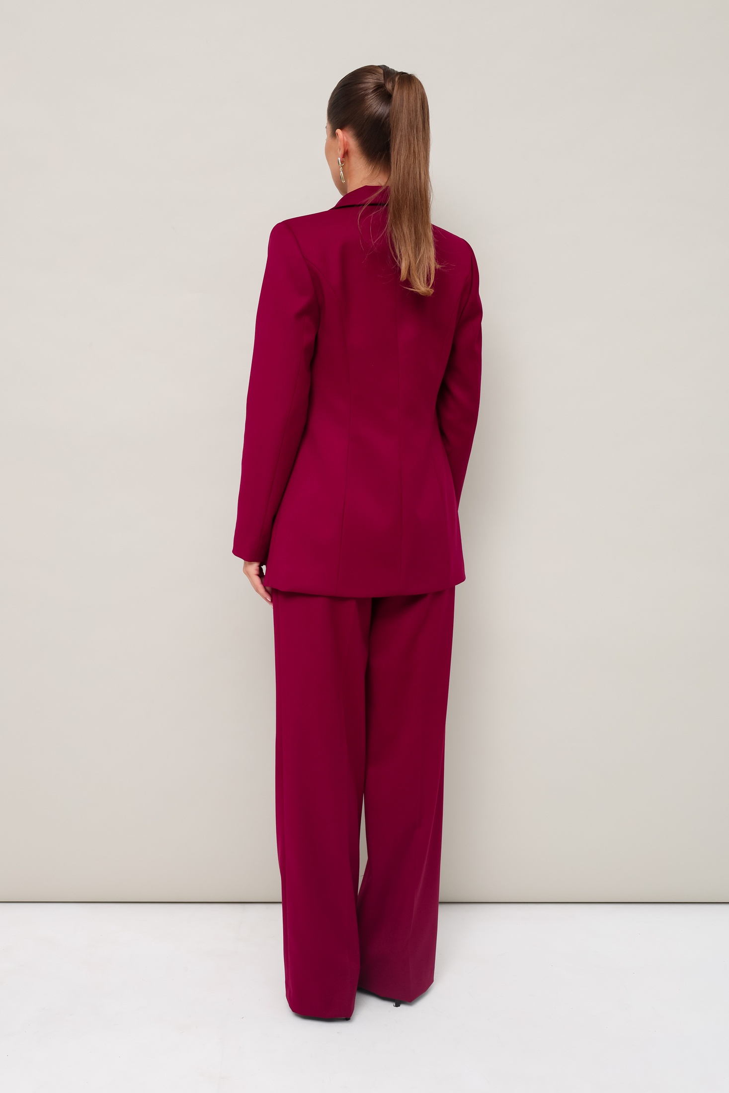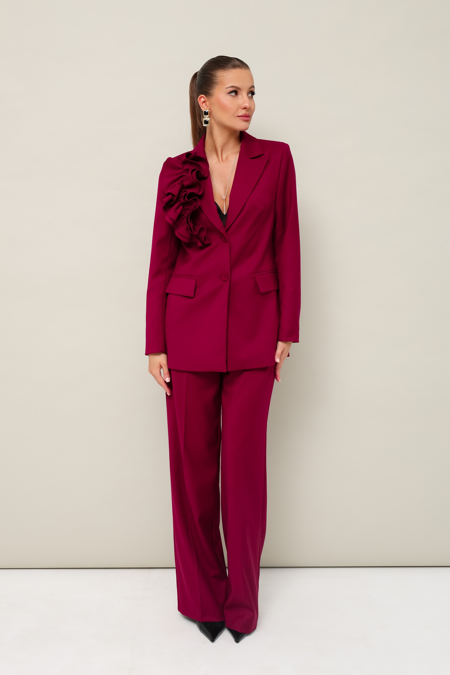 Эффектный 2-предметный комплект, состоящий из жакета и брюк, выполненный из костюмной ткани. Жакет женский полуприлегающего силуэта с центральной застежкой на петли и обтяжные пуговицы. Воротник пиджачного типа с отложными лацканами. Спереди обработаны прорезные карманы в рамку с клапанами. Рукава втачные двухшовные. Спинка со средним швом и рельефами. Изделие обработано подкладкой. Брюки прямого силуэта с заутюженными стрелками и с боковыми наклонными карманами. Пояс притачной с застежкой на пуговицу и тесьму-молнию, по спинке пояс на резинке для регуляции размера. В комплекте прилагается съемная брошь из основной ткани.