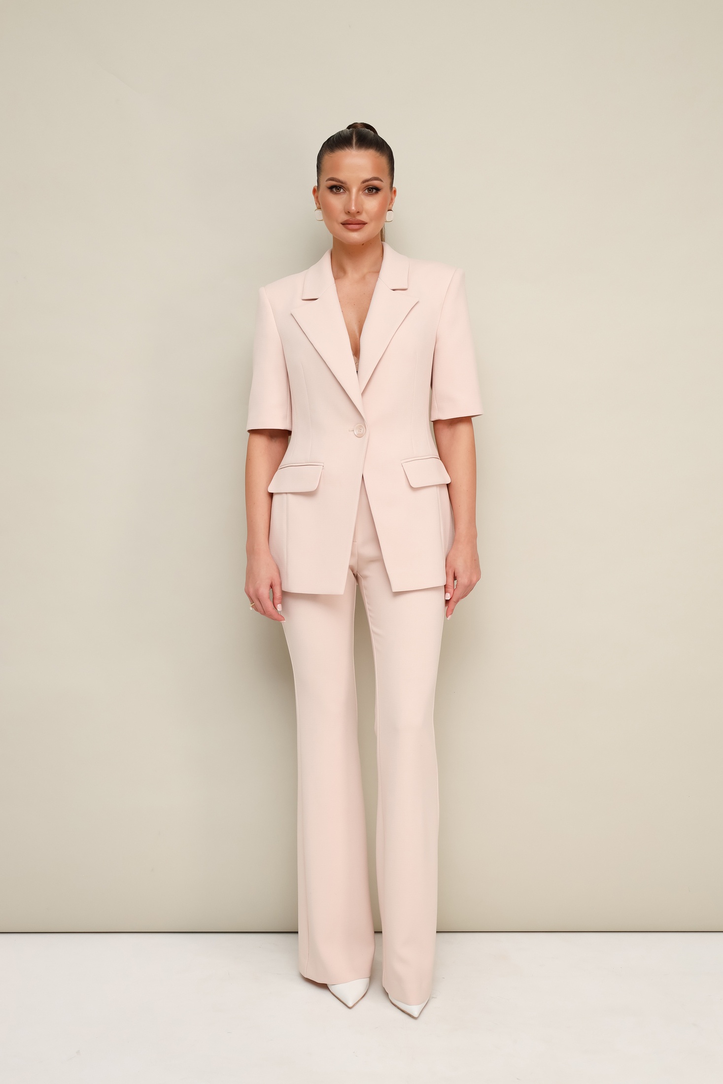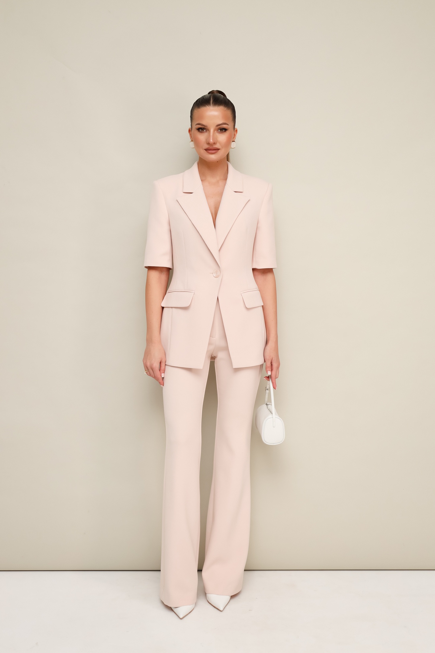 Костюм брючный 11-470 Pur Pur — воплощение стиля и функциональности. Коллекция бренда Pur Pur предлагает двухпредметный комплект из жакета и брюк, выполненный из костюмной ткани с полиэстером, вискозой и спандексом, обеспечивающих комфорт и долговечность. Жакет с петлей и пуговицей, а воротник пиджачного типа с лацканами создают классический стильный вид. Двухшовные рукава длиной до локтя делают его идеальным для офисного или повседневного гардероба. Брюки-клеш с силуэтом bootcut и притачным поясом обеспечивают удобную посадку и элегантность. Резинка на спинке добавляет комфорта и регулирует размер. Кремовый цвет костюма хорошо подходит для весенне-летнего сезона, подчёркнутый продуманными деталями, такими как карманы с клапанами.