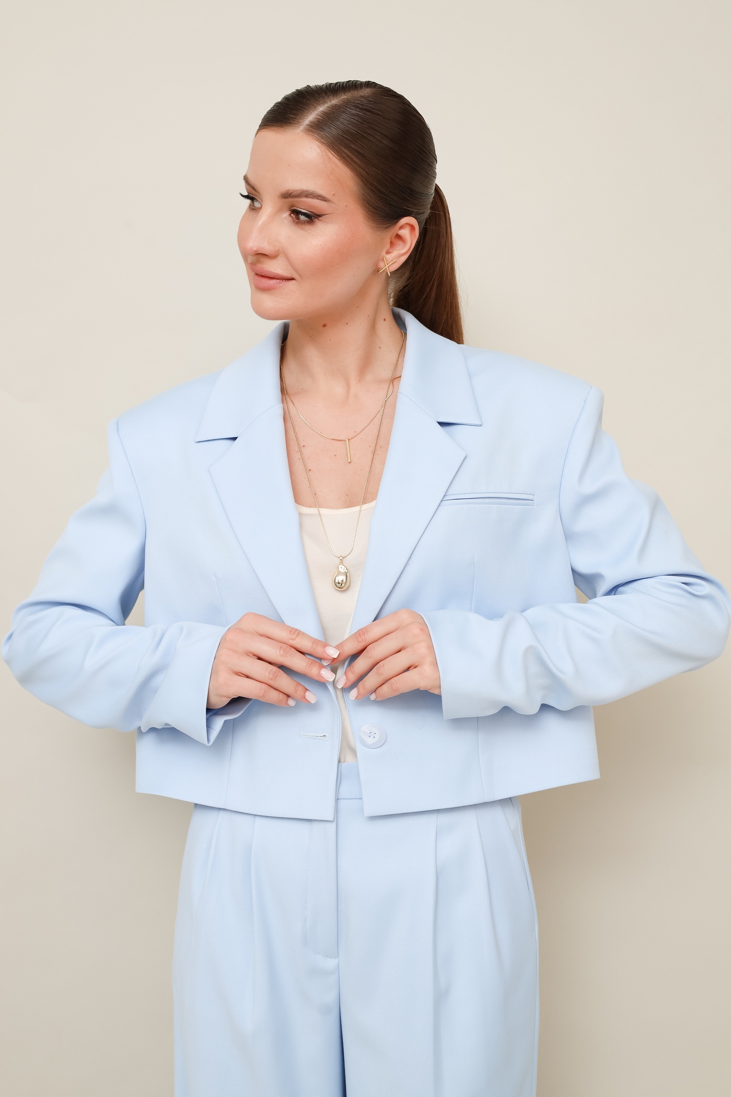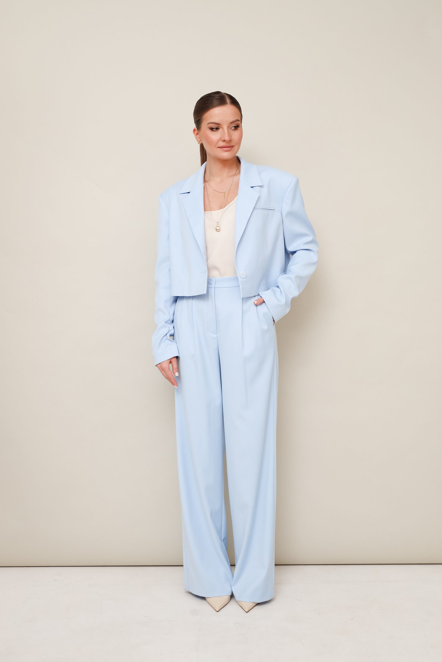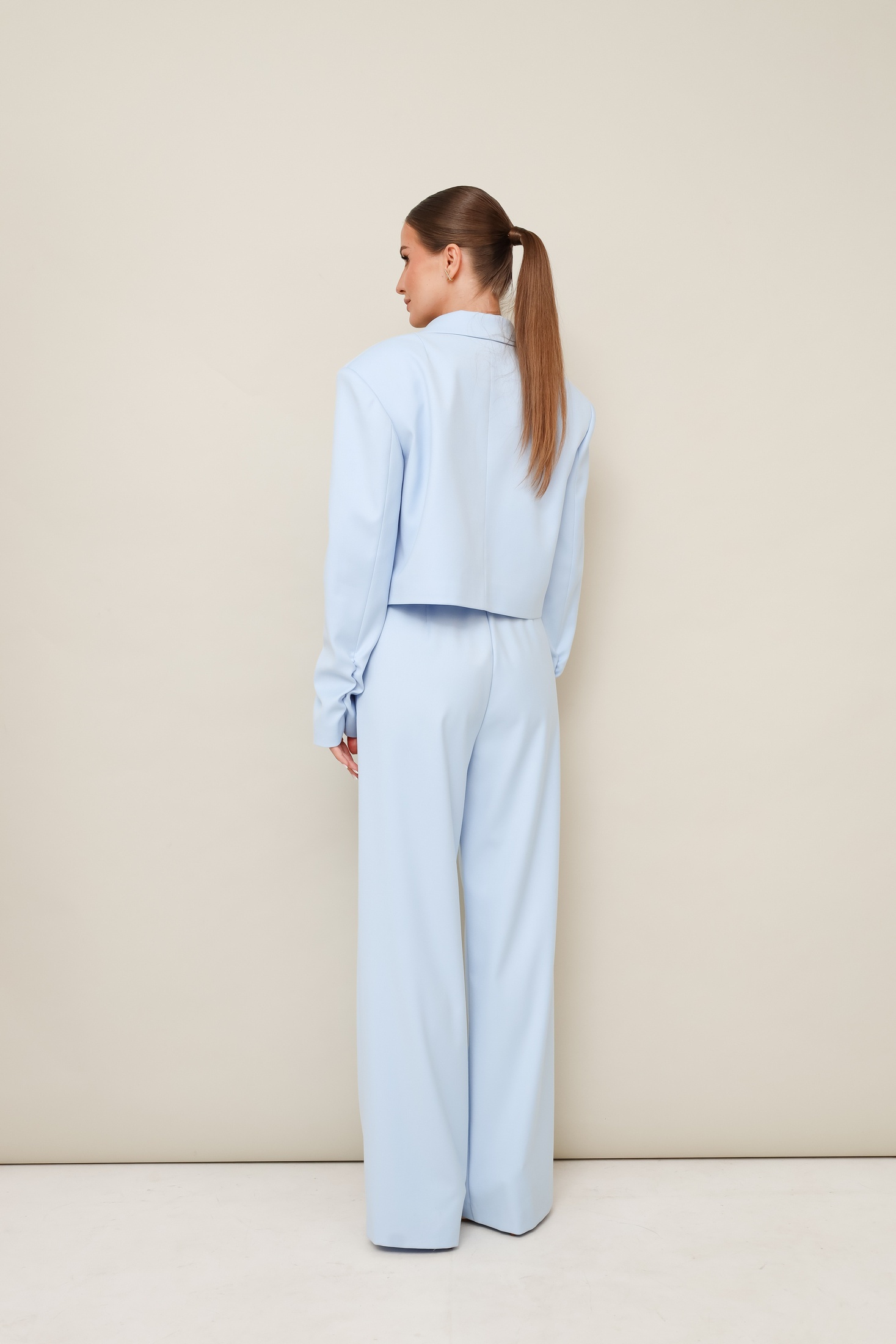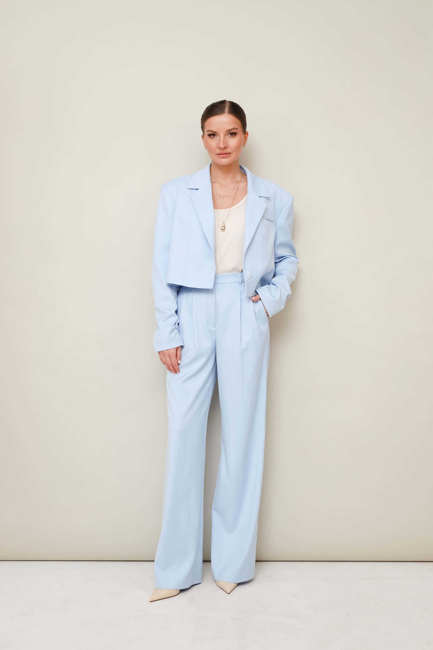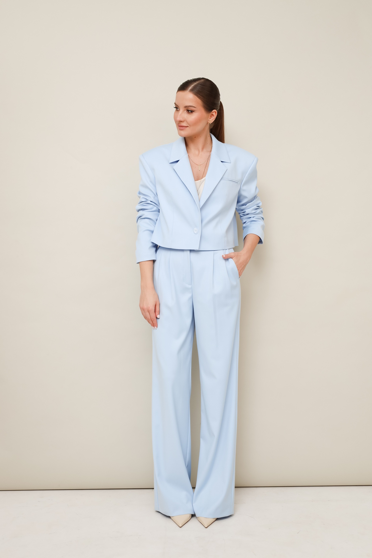 Костюм брючный 11-476 Pur Pur станет идеальным дополнением вашего гардероба. Коллекция бренда Pur Pur включает этот стильный брючный костюм из костюмной ткани, сочетание полиэстера, вискозы и спандекса обеспечивает комфорт и свободное движение. Актуальный укороченный жакет с отложными лацканами и прорезным карманом в рамку создают современный образ. Брюки с высокой посадкой и защипами предлагают дополнительный комфорт благодаря регулируемому эластичному поясу. Голубой цвет костюма идеально подходит для весны и лета, делая его универсальным выбором для офисного или повседневного стиля. Центральная застёжка на петлю и пуговицу подчеркивает внимание к деталям, а легкая сборка внизу рукавов добавляет элегантности.