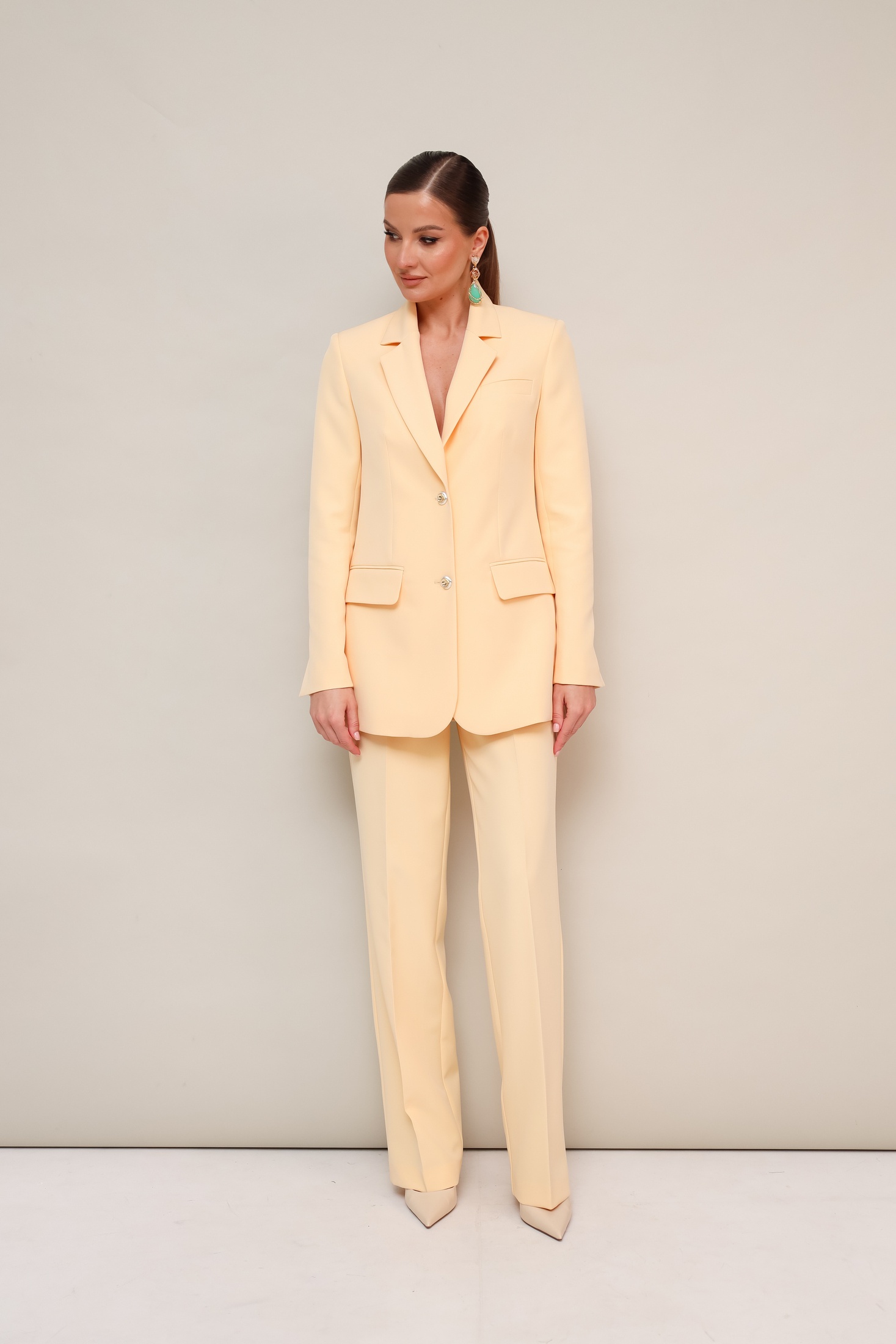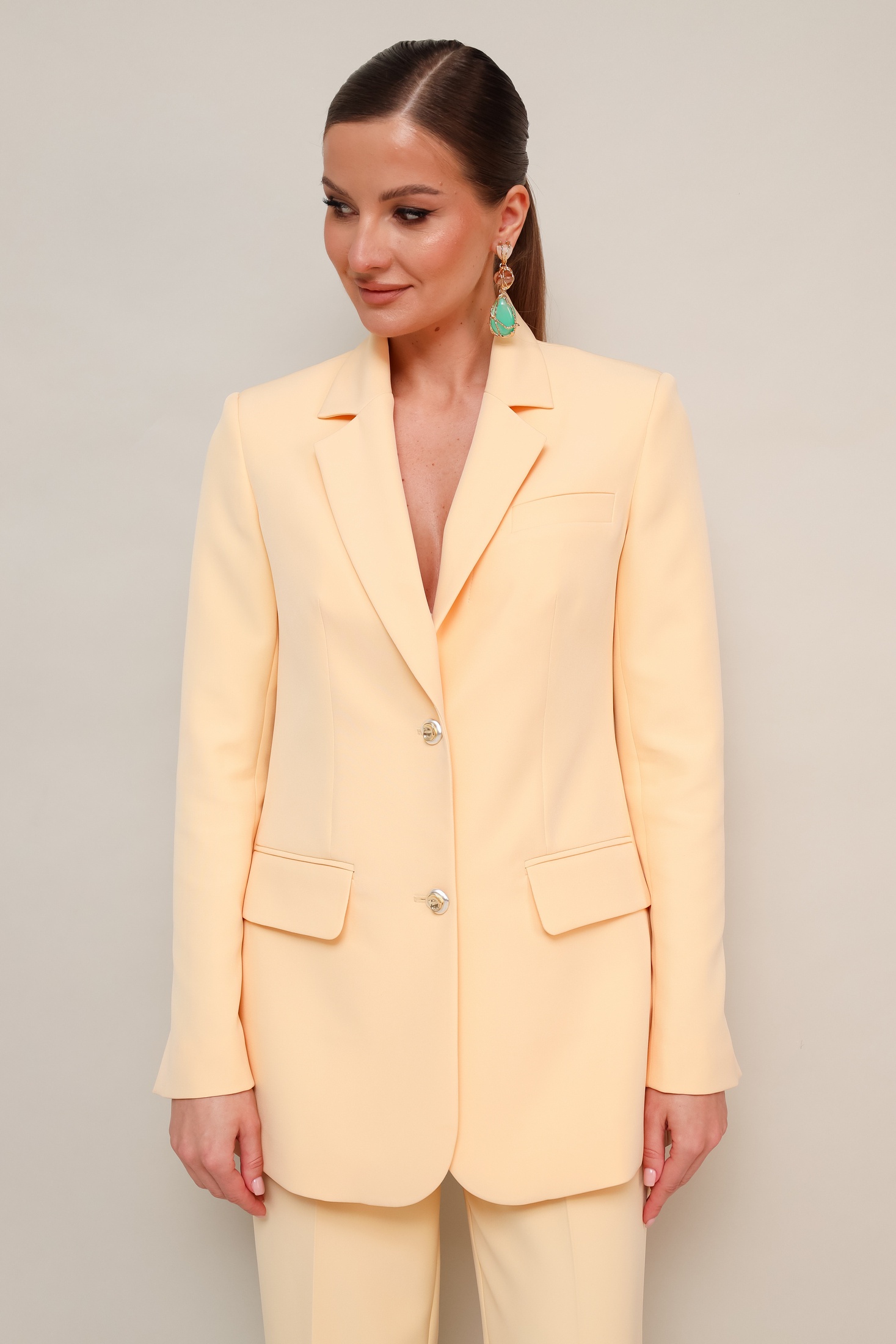 Костюм брючный 11-477 Pur Pur — стильный выбор для современного гардероба. Коллекция бренда Pur Pur предлагает брючный костюм, выполненный из гладкой костюмной ткани с добавлением полиэстера и спандекса, обеспечивающим удобство и поддержку. Жакет полуприлегающего силуэта с отложными лацканами и скругленным низом придаёт элегантность и утонченность. Декоративная нашивка на рукаве добавляет особый акцент. Прорезные карманы в рамку с клапанами подчеркивают практичность и стиль. Брюки прямого силуэта с боковыми карманами и заутюженными стрелками создают утонченный классический образ. Легкость и комфорт в носке обеспечивается благодаря подкладке. Изысканный бежевый цвет делает костюм подходящим для любого сезона, идеально сочетая стиль и комфорт.