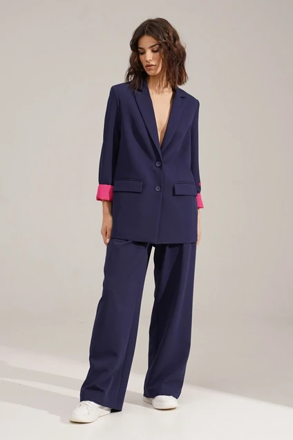 Костюм состоит из жакета и брюк. Жакет свободного покроя на подкладке контрастного цвета. Застежка на пуговицы. По спинке средний шов со шлицей. Рукав втачной. На полочках карманы в рамку с листочками и клапанами. На спинке и рукаве жакета- авторская печать. Брюки прямые, с центральной застежкой на пуговицу и молнию. В боковых швах карманы.