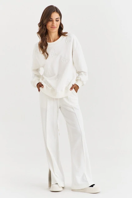 Костюм, состоящий из джемпера и брюк. Джемпер свободного кроя, со спущенной линией плеча, с длинным рукавом. Горловина округлой формы. Горловина, низ изделия и низ рукава обработаны отделочной тканью (кашкорсе). По переду выполнена авторская вышивка. Брюки палаццо на притачном поясе с резинкой, в который вставлен шнур с декоративными наконечниками. В боковых обработаны карманы с наклонным входом. По задним и передним половинам застрочены стрелки. В области низа, по боковым обработаны шлицы.