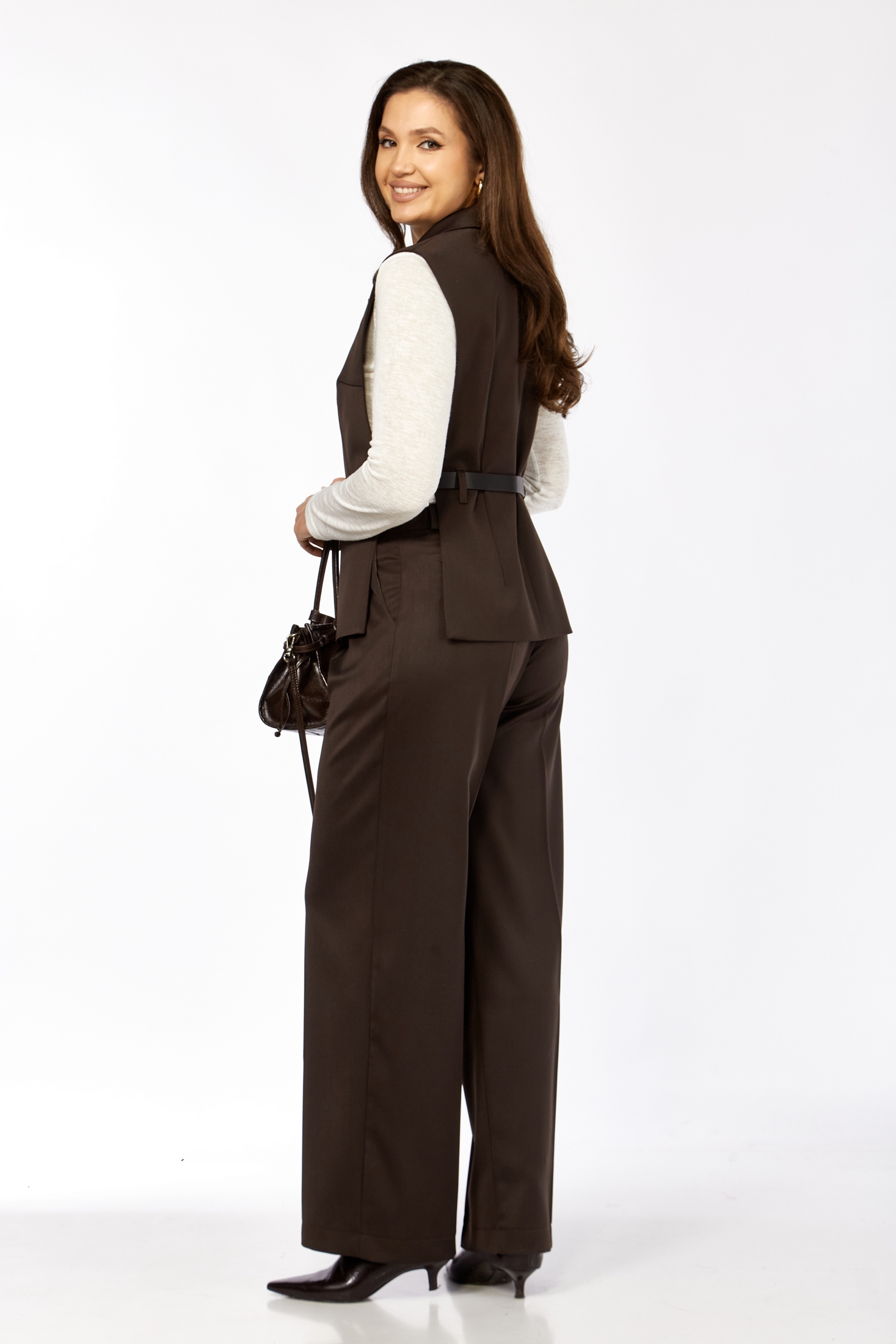 - Жилет: приталенный крой подчёркивает линии силуэта, а V-образный вырез визуально удлиняет шею и делает образ более утончённым. Застёжка на потайные кнопки добавляет аккуратности и минимализма.