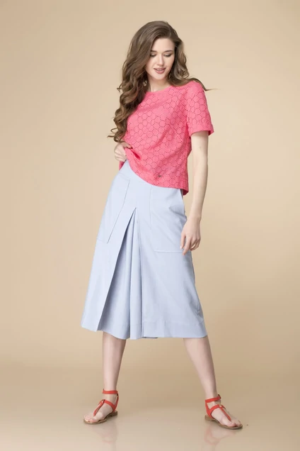 Костюм женский предназначен для повседневной носки. Костюм двух предметный: блузон и юбка-брюки. Блузон женский прямого силуэта, длиной ниже линии талии на 10 см. Перед цельнокроеный с двумя нагрудными вытачками, низ декорируется настрочной аппликацией. Спинка цельнокроеная. Горловина круглая, обтачная, без воротника. Блузон со спущенной проймой. Рукав втачной, короткий, одно шовный с отложной манжетой. Блузон без плечевых накладок. Юбка-брюки прямая, длиной до середины икры, с отрезной кокеткой, с двумя нагрудными прямоугольными карманами с наклонным входом и двумя фигурными накладными карманами на задних половинках. Застежка на потайную тесьму-молнию в левом боковом шве. Верхний срез обтачной. Длина спинки блузона44- 50рры 50 см, 52-56рры 53 см. Длина рукава 44-50рры16.5 см, 52-56 рры 18 см. Длина юбки-брюк 44-56 рры 75 см