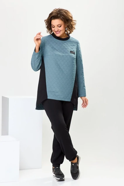 Костюм женский, предназначен для повседневной носки. Костюм женский, 2-х предметный, свитшот и брюки. Свитшот прямого силуэта с фигурным низом. Центральная часть переда из отделочной ткани, с 2-мя нагрудными вытачками. Над левой вытачкой пришивная аппликация; с 2-мя притачными бочками. Спинка из отделочной ткани с горизонтальным подрезом на уровне линии бёдер, нижняя часть подреза с 2-мя конструктивными вытачками. Горловина круглая с приточной планкой. Застёжка на втачную металлическую молнию на спинке. Рукав втачной, 2-х шовный, длинный. Брюки женские, слегка заужены к низу, длинные с притачными манжетами. Передние половинки с накладными прямоугольными карманами. Задние половинки с талевыми вытачками. Брюки с притачным поясом, собранным на эластичную тесьму, закреплённую 2-мя отделочными строчками, образующими кулису с 2-мя пробивными блочками и втянутым декоративным шнуром. Длина брюк по боковому срезу 98 см, Длина спинки свитшота 83 см, длина рукава 59 см.