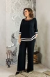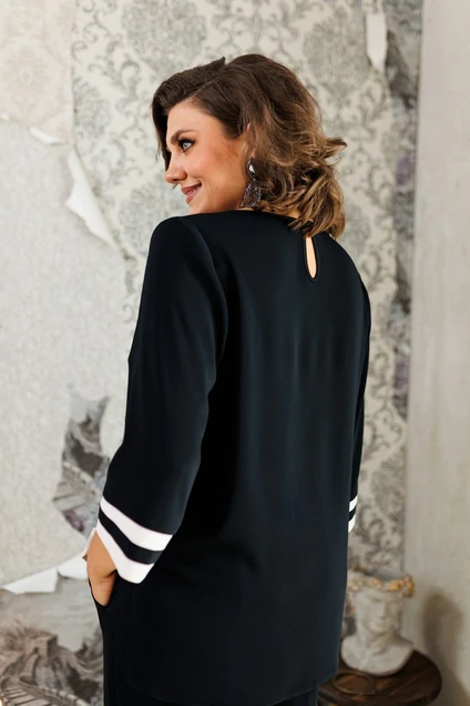 Костюм женский, относится к торжественной одежде. Костюм женский 2-х предметный, блузон и брюки. Блузон женский прямого силуэта, длиной ниже линии бёдер. Перед с 2-мя нагрудными вытачками, с декоративной вставкой по горловине, с горизонтальным подрезом внизу, с чередованием горизонтальных вставок из отделочной ткани. Спинка вверху с разрезом "капелькой"обработанным косой бейкой, фиксирующимся на 1-ну навесную петлю и 1-ну пришивную пуговицу. Горловина круглая, без воротника, обработана косой бейкой. Рукав втачной, одношовный, длиной 3/4, с притачной манжетой с чередованием горизонтальный вставок из отделочной ткани. Боковые швы с разрезами, низ фигурный, низ фигурный "ступенька". Блузон с плечевыми накладками. Брюки женские прямые, длинные. Передние половинки с карманами в боковых швах. Задние половинки с таллиевым вытачками. Брюки с притачным поясом, собранным на эластичную тесьму, закреплённую 2-мя отделочными строчками. Длина брюк по боковому срезу 103 см. Длина спинки блузона 74 см, длина рукава 47 см.