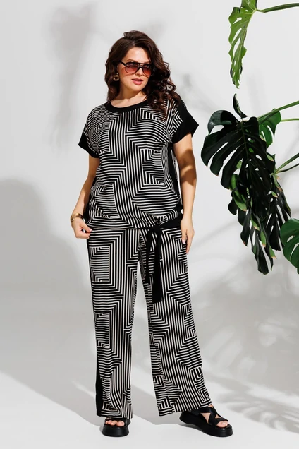 Костюм женский, предназначен для повседневной носки. Костюм женский 2-х предметный блузка и брюки. Блузка женская, прямого силуэта, длиной ниже линии бёдер. Перед с 2-мя нагрудными вытачками, с 2-мя притачными бочками из отделочной ткани, выходящими из вытачек, с притачной планкой из отделочной ткани по горловине. Спинка с притачной планкой из отделочной ткани по горловине. Плечевой шов с притачным погоном из отделочной ткани. Горловина круглая обтачная без воротника. Рукав втачной короткий одно шовный из отделочной ткани. Блузка с притачным поясом из отделочной ткани по низу с цельнокроеными завязками. Блузка без плечевых накладок. Брюки женские прямые длинные. Передние половинки с притачными лампасами из отделочной ткани, с карманами в боковых швах. Задние половинки с таллиевыми вытачками. Брюки с притачным поясом, собранным на эластичную тесьму, закреплённую 2-мя отделочными строчками. Длина брюк по боковому срезу 105 см. Длина спинки блузки 64 см, длина рукава 6 см.