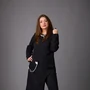 Брючный комплект из костюмной ткани на подкладке. Двубортный жакет выполнен в стиле оверсайз. Воротник-с отложными лацканами пиджачного типа, рукава - двухшовные. По переду- прорезные карманы с клапанами. Жакет имеет два ряда пуговиц, застегивается на две основные пуговицы, одну потайную, остальные пуговицы несут декоративный характер. Брюки-клеш с началом расширения от колена. Брюки с двумя карманами и поясом-обтачкой. Застегиваются на молнию по переду и одну пуговицу. Цвет зеленый.