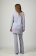 Брючный комплект из костюмной ткани на подкладке. Жакет двубортный. Воротник-с отложными лацканами пиджачного типа, рукава - двухшовные. По переду- прорезные карманы с клапанами. Жакет застегивается на две основные пуговицы, одну потайную. Брюки-клеш плотно сидящие по фигуре, расширены к низу, начало расширения выше колена 5 см. Брюки с двумя карманами округлой формы и поясом-обтачкой. Застегиваются на молнию по переду и одну пуговицу.