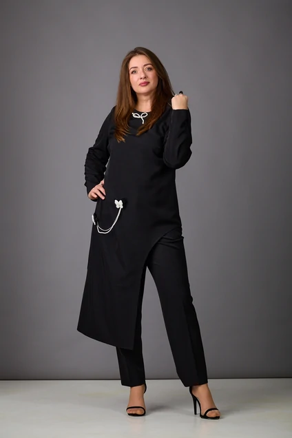 Роскошный комплект из стрейчевой костюмной ткани, состоящий из блузы и брюк. Асимметричная блуза с вытачками по переду и спинке. Рукава втачные, длинные. Блуза застегивается на молнию в среднем шве спинки. Брюки слегка заужены к низу, с поясом. Посадка-средняя. Застегиваются на молнию по переду и одну пуговицу.