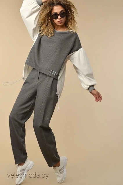 Костюм состоит из блузки и брюк. Блузка свободного силуэта. Горловина и низ рукавов на манжетах-довязах. Передняя полчка из трикотажного полотна. Внизу полочки- декоративная печать. Спинка и рукава выполнены из хлопковой ткани. Спущенное плечо, широкий рукав со сборкой на манжете. Спинка на кокетке с центральной складкой. Спинка длиннее переда, низ спинки на кулисе. Брюки на поясе, частично на резинке. В районе пояса небольшие складки. Карманы в боковых швах. Впереди центральная застежка на молнию.