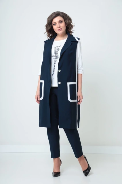 Стильный комплект состоящий из жилета, топа и брюк. Жилет прямого силуэта. По переду рельефы и накладные карманы. Застежка - молния. По полочке нагрудные выточки. Брюки прямые, со средней посадкой, слегка зауженые к низу. По переду втачные карманы, застежка молния и пуговицы. Длина брюк в 50 размере по боковому шву 90 см и + 5 см пояс.