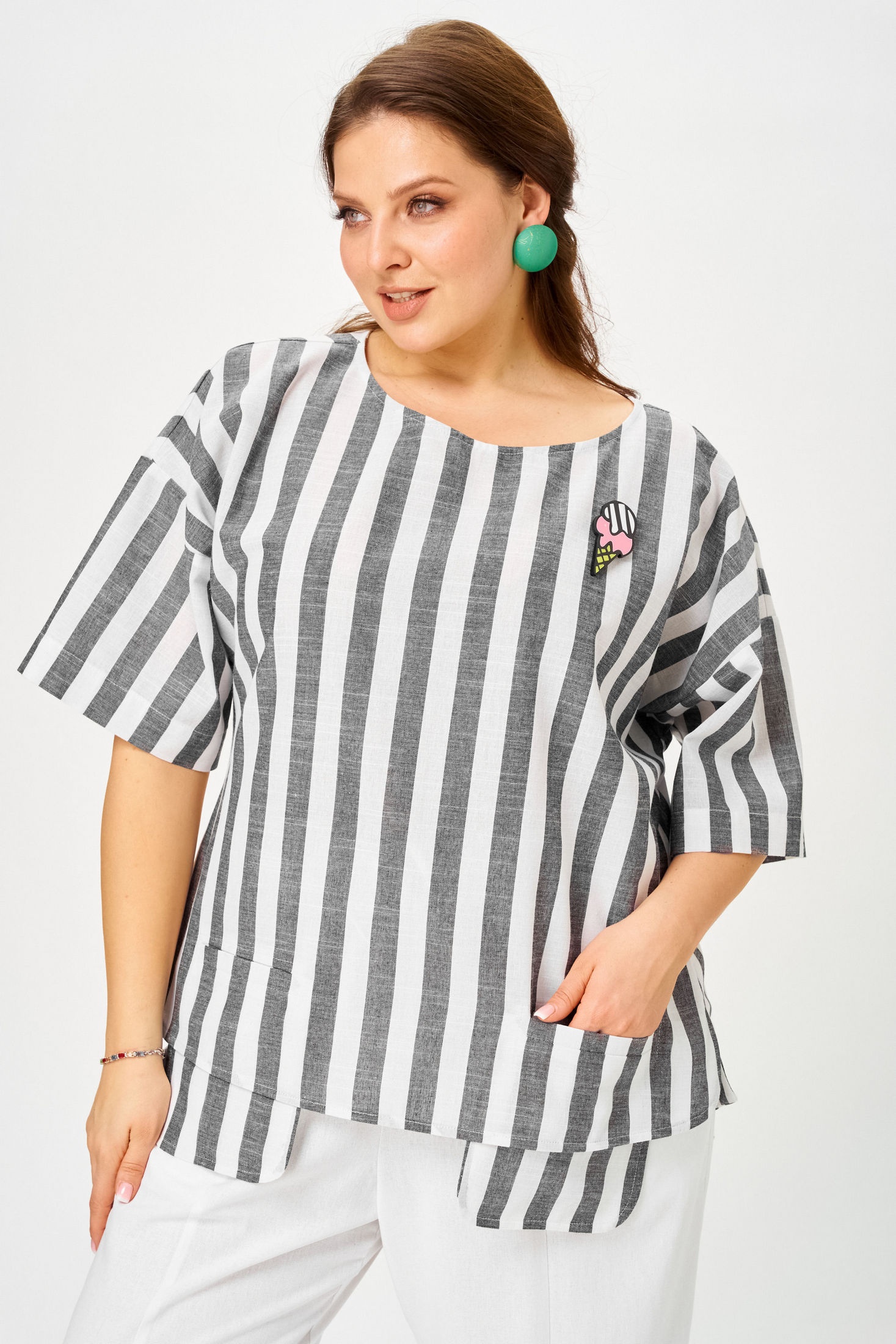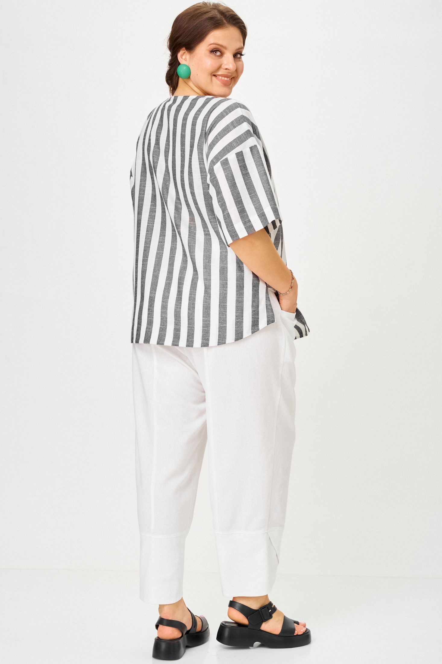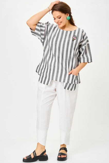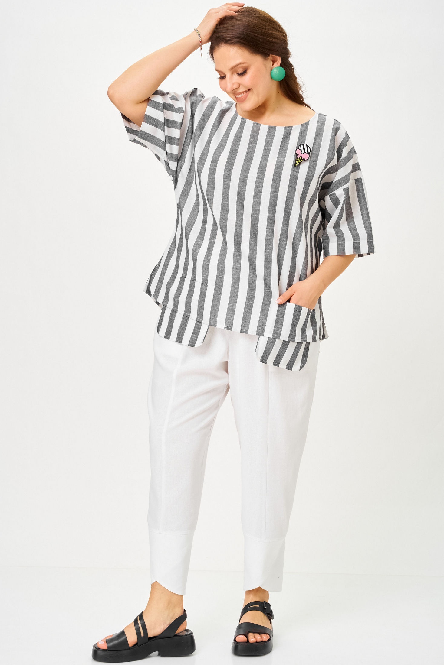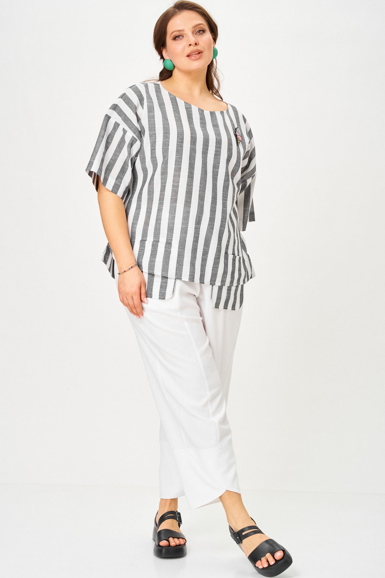 Костюм брючный 11314 SOVA — идеальный выбор для жарких летних дней. Коллекция бренда SOVA предлагает комфорт и стиль в оверсайз комплекте из дышащего льна, который прекрасно подходит для женщин плюс сайз. Свободного кроя блузон и укороченные брюки с круговой резинкой на поясе и шнурком для дополнительной регулировки обеспечивают идеальную посадку. Функциональные карманы и низ брюк на фигурной обтачке добавляют практичности и визуальной легкости. Отлично подойдет для повседневной носки на улице и в помещении. Серый и белый цвет в сочетании с полосатым рисунком придают костюму современный вид. Подчеркивая вашу индивидуальность, этот костюм станет фаворитом летнего гардероба.