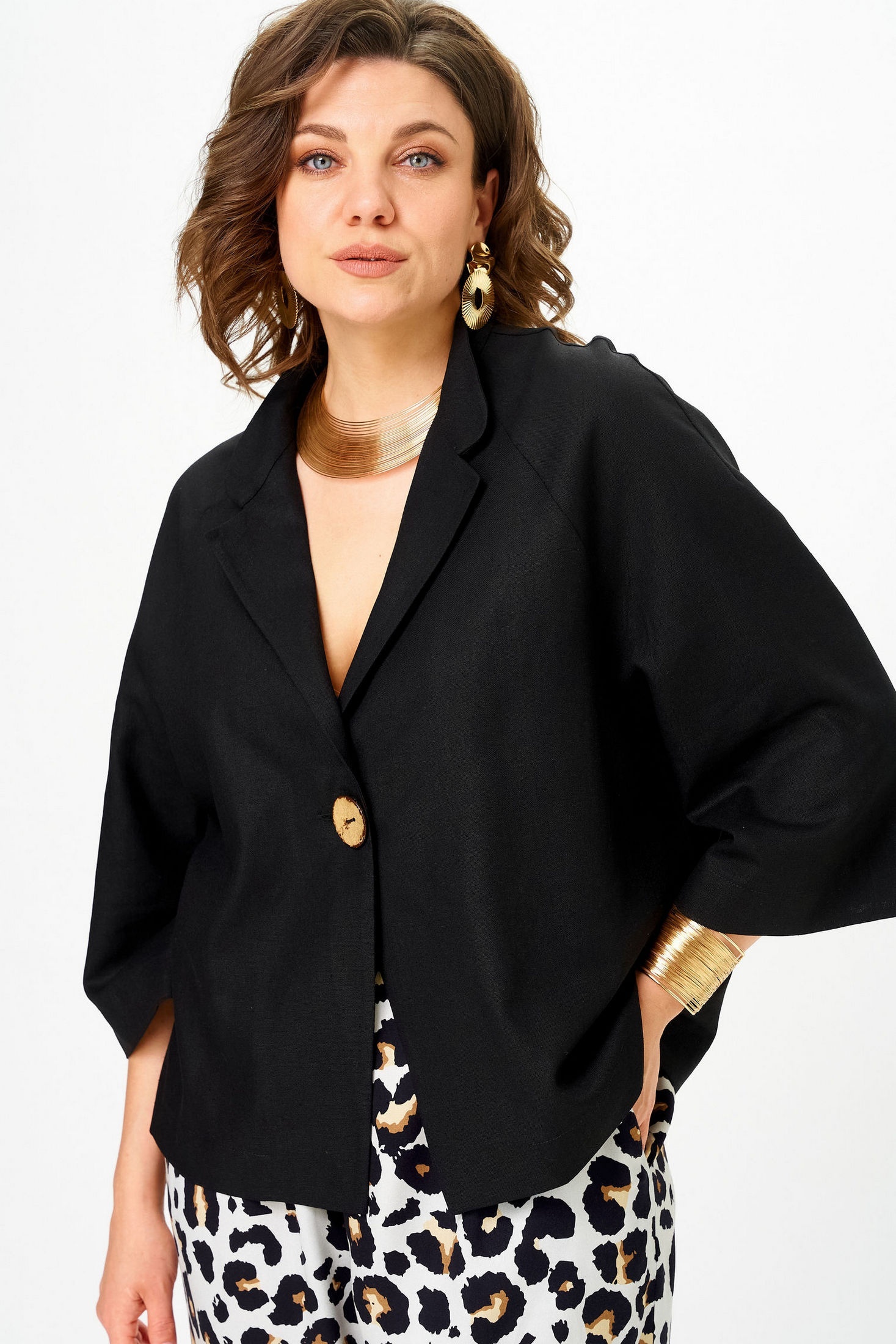 Костюм брючный 11332 черный леопард SOVA от бренда SOVA — идеальный выбор для теплого сезона. Коллекция бренда SOVA сочетает в себе легкость льняного жакета и комфорт свободных брюк из вискозы с актуальным леопардовым принтом. Свободный жакет с регланом и застежкой на одну пуговицу подчеркивает стильный образ, а палазцо брюки с поясом на резинке гарантируют удобство и легкость. Универсальный черный цвет жакета уравновешивает яркий принт, делая костюм подходящим для повседневных прогулок и вечерних выходов. Рукава 3/4 и карманы в боковых швах добавляют практичности и функциональности всему образу.