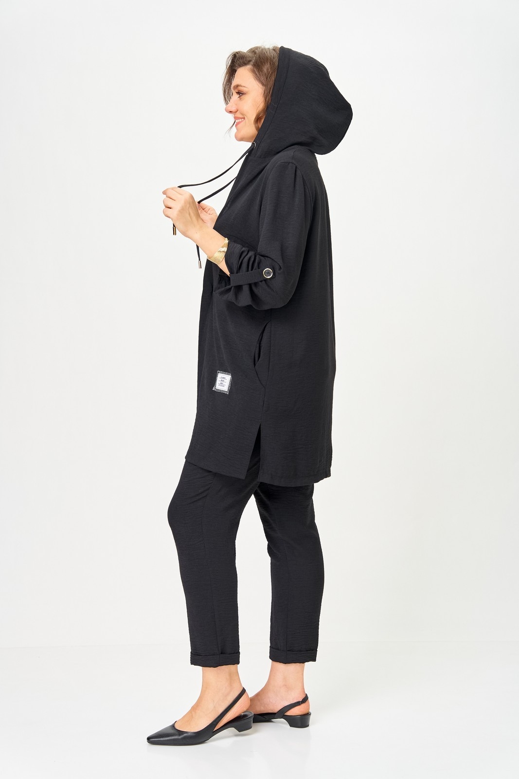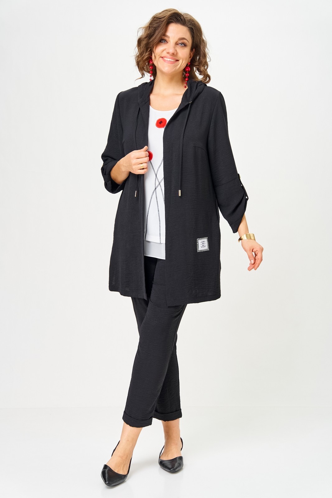 Костюм брючный 1527 черный Svetlana Style сочетает в себе комфорт и стиль. Коллекция бренда Svetlana Style предлагает трехпредметный комплект, включающий кардиган, топ и брюки. Кардиган с капюшоном и шнурком, фиксирующимися рукавами и боковыми карманами добавляет практичности. Топ полуприлегающего силуэта с аппликацией из ткани создает стильный образ. Брюки прямые со швами и притачным поясом на резинке. Модель выполнена из смеси полиэстера, хлопка и спандекса, что обеспечивает комфорт при носке. Черный цвет костюма делает его универсальным в использовании в любое время года. Длина кардигана составляет 85 см, а длина брюк — 92 см. Длина рукава 43 см. Длина топа 70 см.