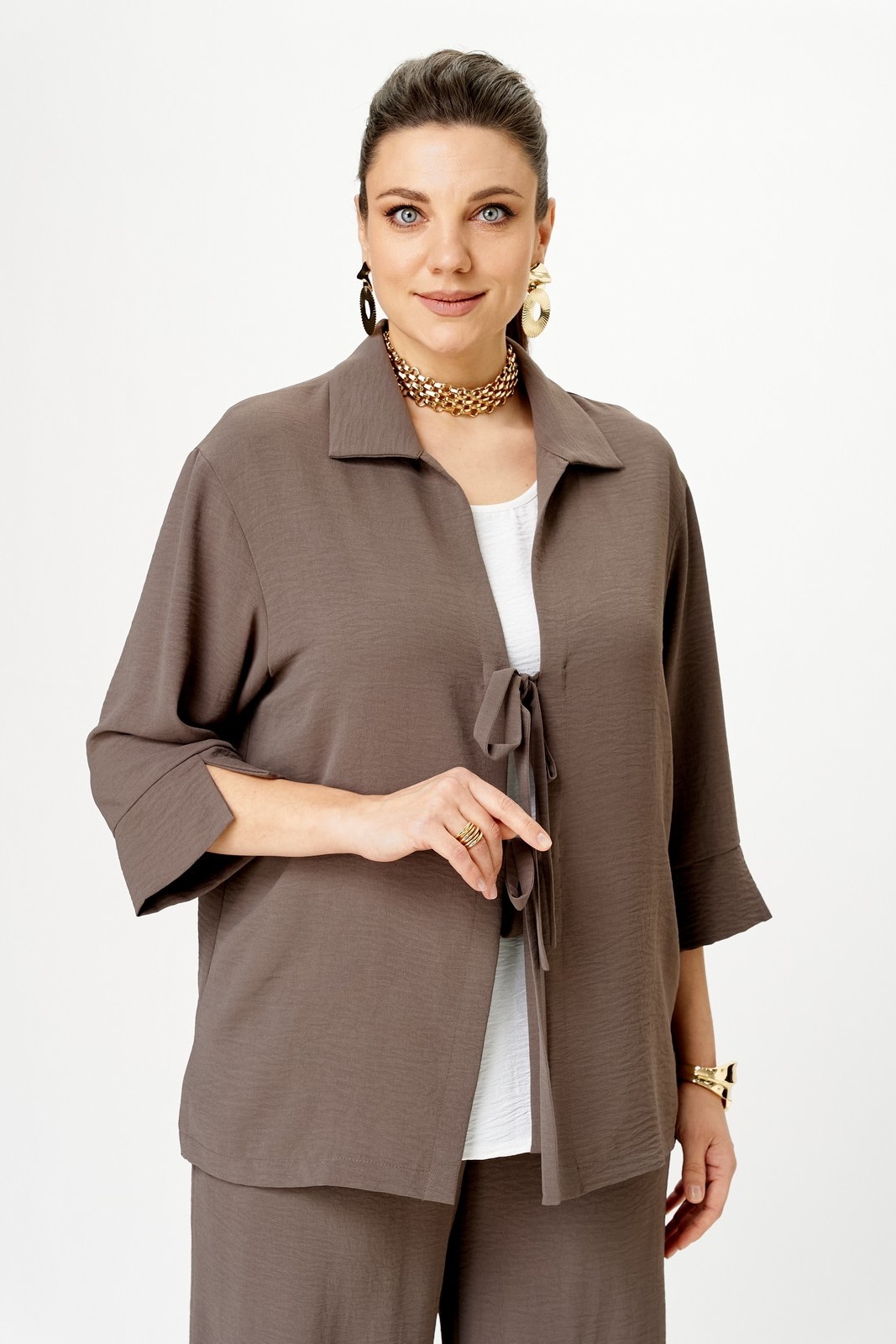 Костюм брючный 2114 мокко Svetlana Style. Коллекция бренда Svetlana Style представляет стильный трёхпредметный костюм, включающий жакет, топ и брюки. Изготовлен из мягкой и комфортной ткани, сочетающей полиэстер, вискозу и спандекс, обеспечивающей прочность и эластичность. Жакет прямого кроя с втачным рукавом и завязками создает игривый и женственный образ. Дополняется отложным воротником и рукавами длиной 3/4 с разрезами на манжетах. Топ полуприлегающего силуэта также украшен боковыми разрезами. Брюки прямого кроя с эластичным поясом дополняют образ. Цвет мокко подходит для любых сезонов и делает костюм универсальным выбором для работы или прогулок. Длина жакета по спинке: 70 см, длина топа: 63 см, длина брюк: 107 см.