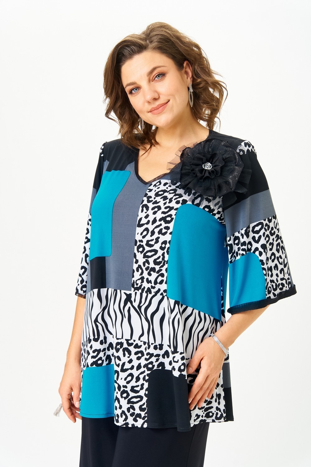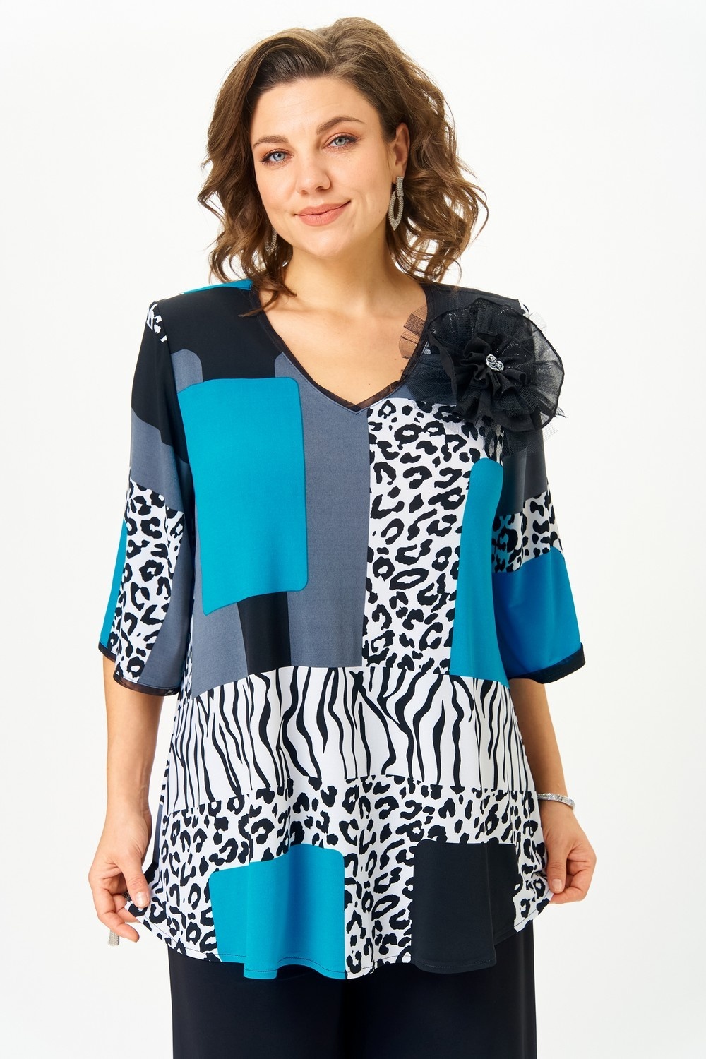 Костюм женский двухпредметный состоящий из блузки и брюк. Блузка А-силуэта с втачным рукавом. Вырез орловины v- образной формы. Рукав длиной 3/4 расширен к низу. По горловине и по низу рукава бейка из сетки. Украшением служит съемный объемный цветок из отделочной ткани. Брюки палаццо свободного кроя отлично подойдут всем типам фигуры. Спереди расположены скошенные карманы. Верх брюк с притачным поясом на резинке. Длина блузки по спинке: 76 см. Длина рукава: 40 см. Длина брюк: 105 см