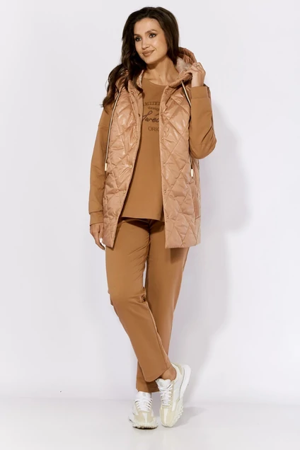 Комплект женский, 3х предметный, состоящий из жилета, свитшота и брюк. Жилет выполнен из плащевой ткани, стеганой на синтепоне, на подкладке. По переду прорезные карманы с листочкой. Застежка центральная на кнопки. Горловина оформлена капюшоном с кулисой по краю. Спинка без особенностей. Свитшот прямого силуэта с длинным, втачным рукавом. Рукав с рельефами и декоративной заплаткой на локте. По низу манжета. Перед задекорирован вышивкой. Вырез горловины круглой формы с подрезной бейкой. По спинке горизонтальный подрез. Брюки прямые, длинные. Спереди наклонные карманы. Пояс притачной, с резинкой по кругу и декоративной кулисой.