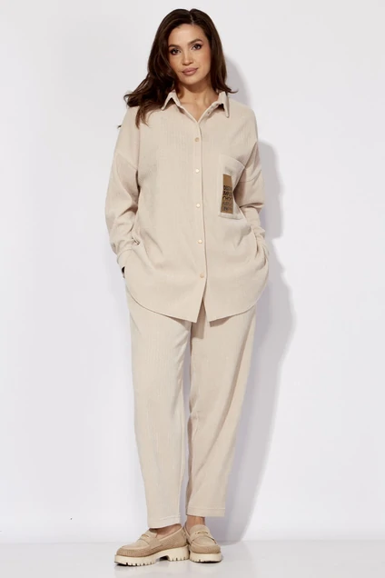 Комплект женский, состоящий из рубашки и брюк.Рубашка женская, прямого силуэта с длинным рукавом. Рукав со спущенной линией плеча, по низу на манжете. Манжета с застежкой на кнопках. Горловина оформлена отложным воротником на отрезной стойке. Застежка центральная на кнопках. По переду один накладной карман задекорированный нашивкой. По боковым швам разрезы. По переду линия разреза скругленной формы. Спинка без особенностей.Брюки-слаксы, объемные, к низу зауженные. Карманы в боковых швах. Сзади накладной карман с декоративной нашивкой. Пояс цельнокроеный, на резинке.